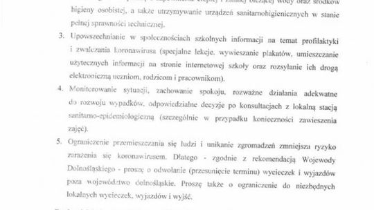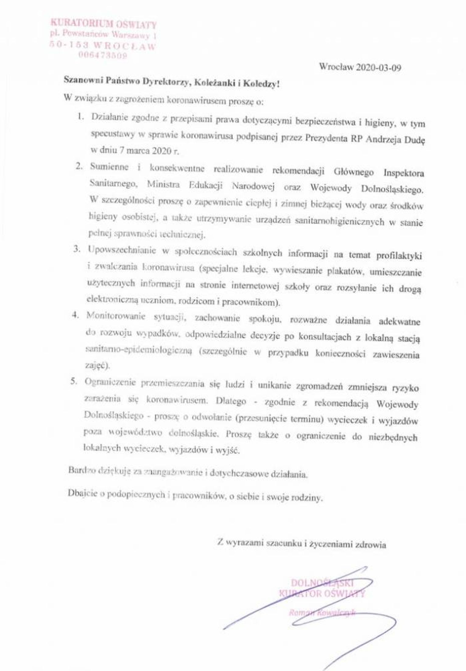 Roman Kowalczyk prosi dyrektorów wszystkich placówek oświatowych na terenie Dolnego Śląska o odwołanie wycieczek i wyjazdów poza województwo, a także o ograniczenie niezbędnych lokalnych wycieczek, wyjazdów i wyjść. Zwraca się też o upowszechnianie w szkołach informacji nt. profilaktyki i zwalczania koronawirusa poprzez organizowanie specjalnych lekcji, wywieszanie plakatów, umieszczania informacji na stronach internetowych oraz rozsyłanie ich uczniom, rodzicom i pracownikom drogą mailową.