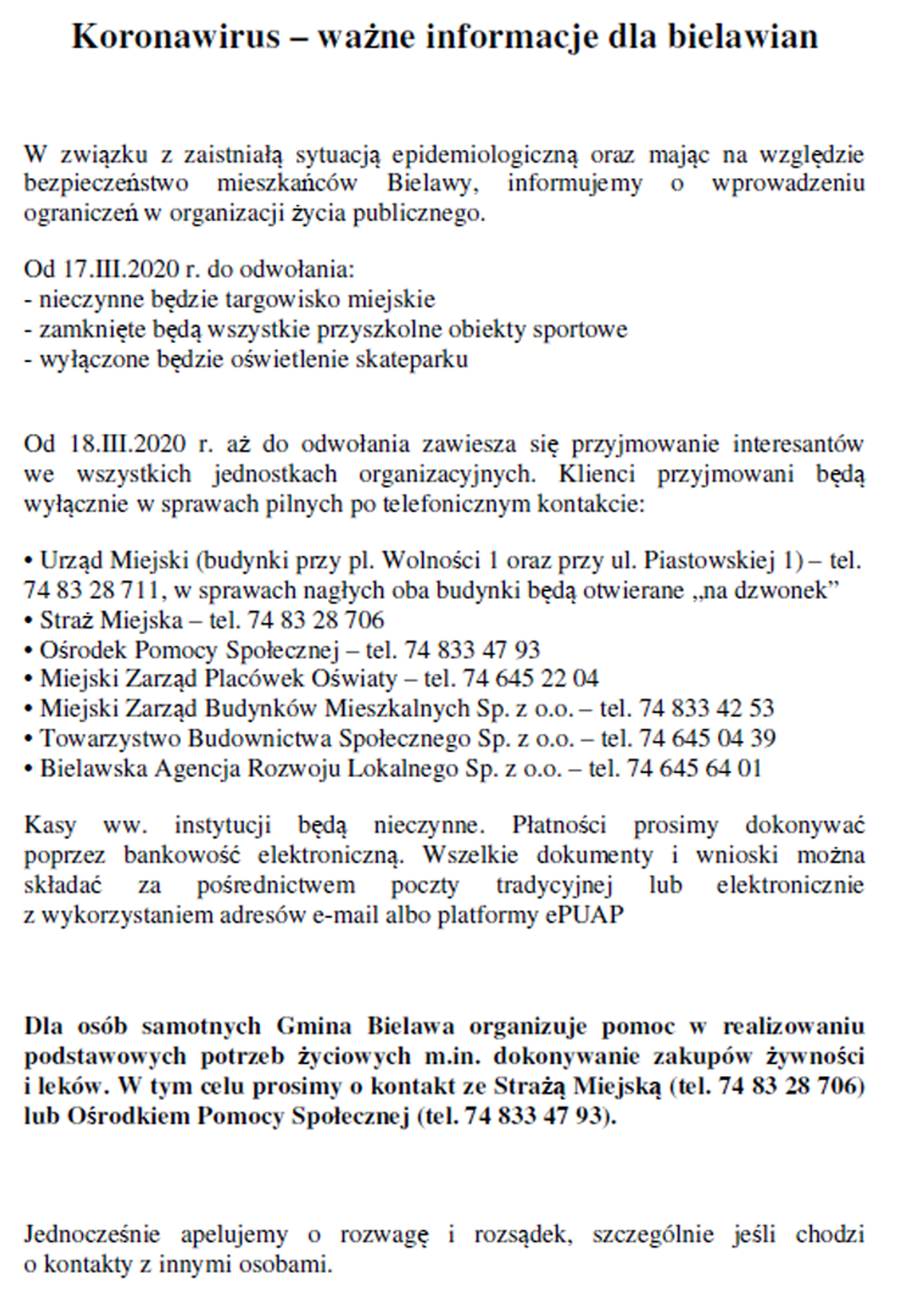 Niestety znaczna część bielawskich seniorów nie ma dostępu ani do cyberprzestrzeni, ani do "Wiadomości Bielawskich". Dlatego też nie mają oni możliwości zdobycia podstawowych informacji, które mogą okazać się pomocne, aby przetrwać ten trudny czas.
