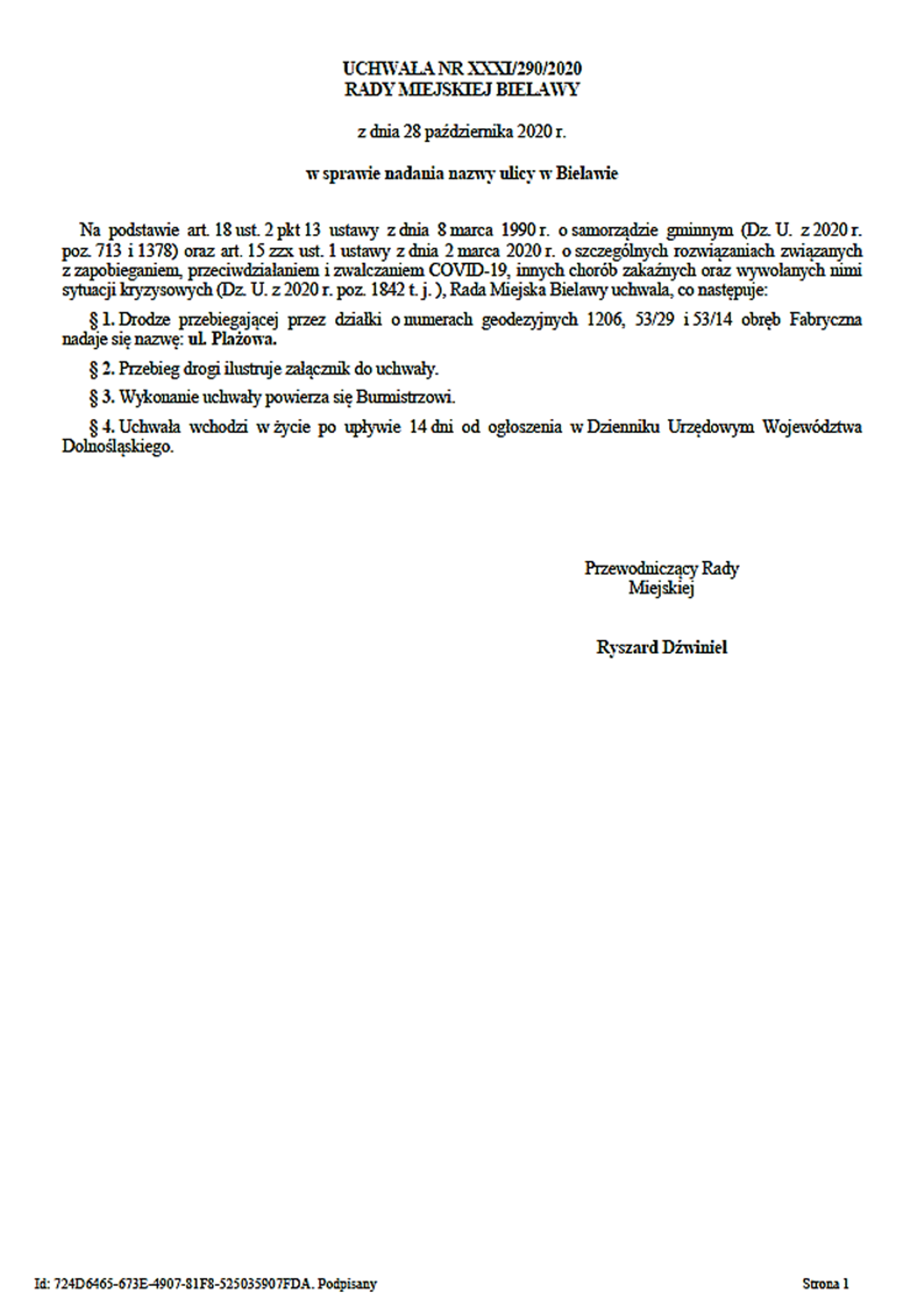 Podczas październikowej sesji Rady Miejskiej bielawscy rajcy zdecydowali o nadaniu nazwy nowo wybudowanej ulicy, która łączy ul. Wysoką z ul. Lotniczą. W uzasadnieniu do uchwały czytamy, że nazwa ulicy "Plażowa" kojarzy się ze zlokalizowanym przy niej kąpieliskiem "Sudecka Plaża", ułatwiając mieszkańcom i odwiedzającym dotarcie do Jeziora Bielawskiego. Jest zwięzła, łatwa w posługiwaniu się i znaczeniowo neutralna.