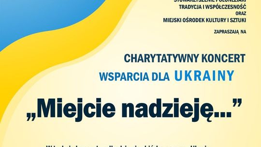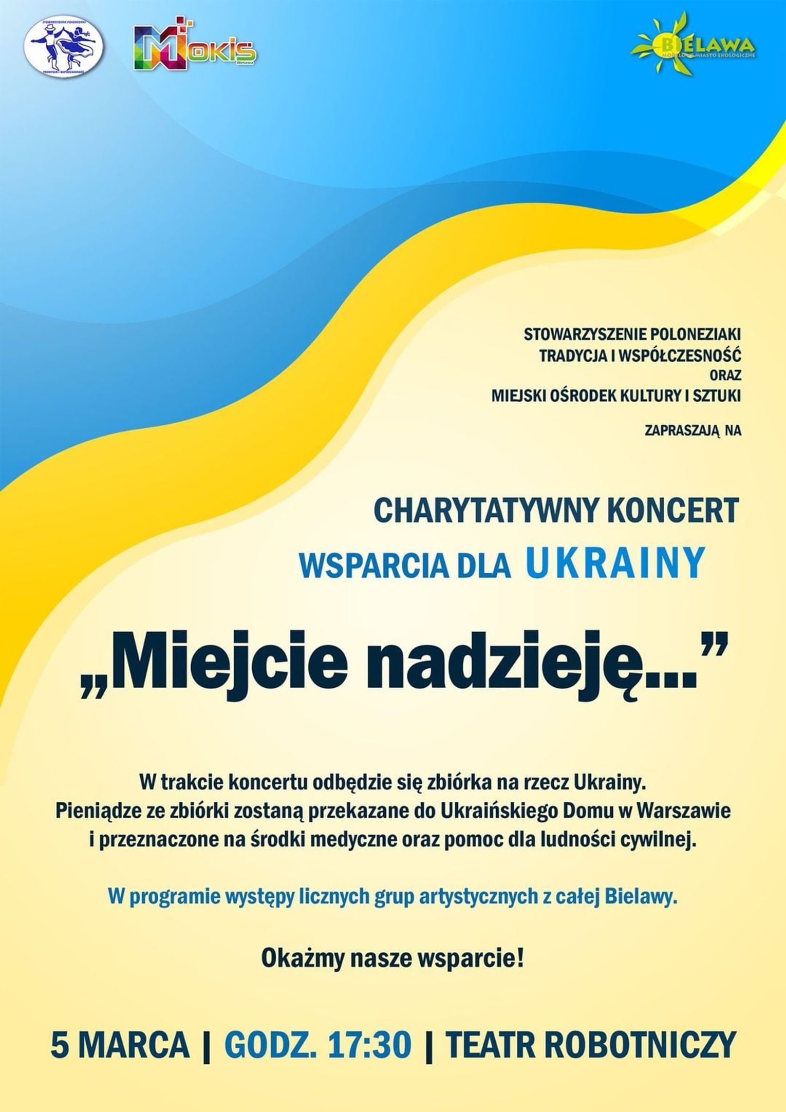 Z kolei Stowarzyszenie "Poloneziaki Tradycja i Współczesność" oraz Miejski Ośrodek Kultury i Sztuki z Bielawy, w dniu 5.III.2022 r. zorganizują w Teatrze Robotniczym charytatywny koncert wsparcia dla Ukrainy pt. "Miejcie nadzieję...". Wystąpią w nim różne grupy muzyczne (w tym taneczne i wokalne) z całej Bielawy. W trakcie imprezy prowadzona będzie zbiórka środków finansowych, środków medycznych oraz pomocy materialnej dla wojennych emigrantów.