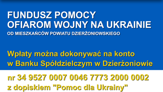 Środki w dowolnej kwocie można wpłacać na konto w Banku Spółdzielczym w Dzierżoniowie o numerze 34 9527 0007 0046 7773 2000 0002 z dopiskiem Pomoc dla Ukrainy.