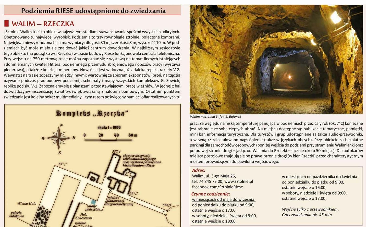 Na odwrocie, w części opisowej, możemy znaleźć charakterystykę Gór Sowich, historię tego regionu, informator krajoznawczy, a także unikalne plany i opisy podziemnych kompleksów Riese (Olbrzym), położonych w okolicach Walimia.