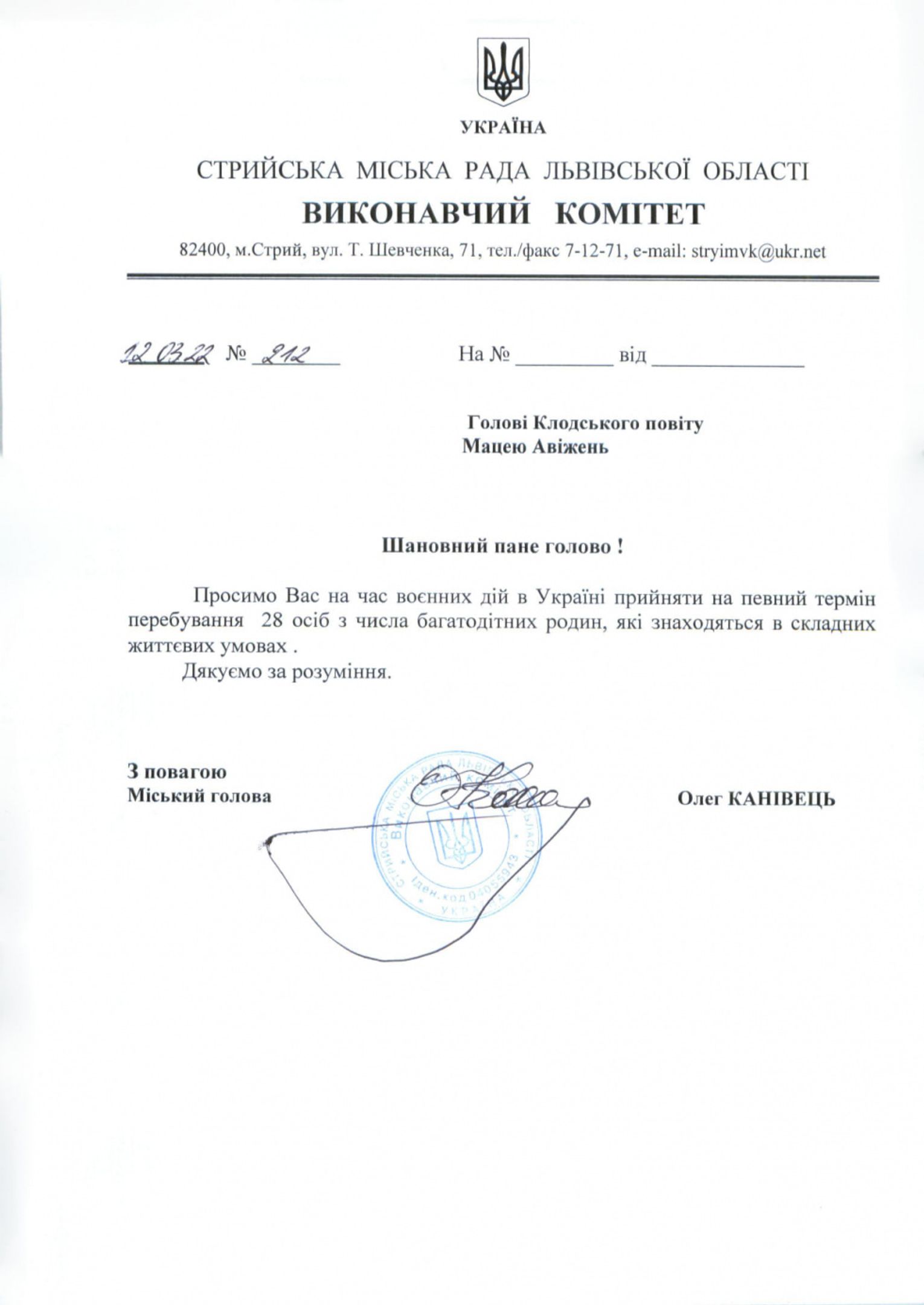Z prośbą o wsparcie zwróciła się strona ukraińska. Transport na granicę został zorganizowany przez powiat kłodzki, przy ponownej współpracy z PKS w Kłodzku S.A. w Restrukturyzacji. Dzieci dołączyły wraz z mamami do siedemdziesięciu trojga dzieci pochodzących z Domu Dziecka w Czerkasach. Łącznie w DWD jest teraz 96 dzieci oraz kilkunastu opiekunów z Ukrainy. W poniedziałek po śniadaniu, wszyscy nowo przybyli, zostali przebadani przez personel medyczny z przychodni Salus Centrum Medyczne w Kłodzku w ramach wolontariatu. Na szczęście dzieci są zdrowe i nie wymagają interwencji. Powiat kłodzki zapewnia dzieciom wszelką opiekę, również psychologiczną. Dzieci zostaną w naszym ośrodku tak długo jak będzie to potrzebne. Ze względu jednak na ograniczone możliwości finansowe jakie obecnie posiadają samorządy, prosimy Państwa o wsparcie.