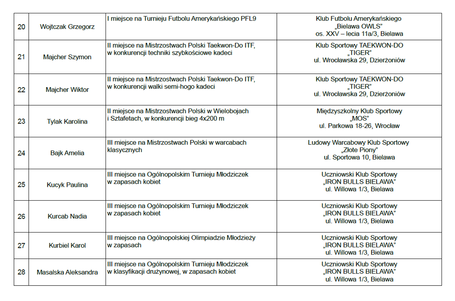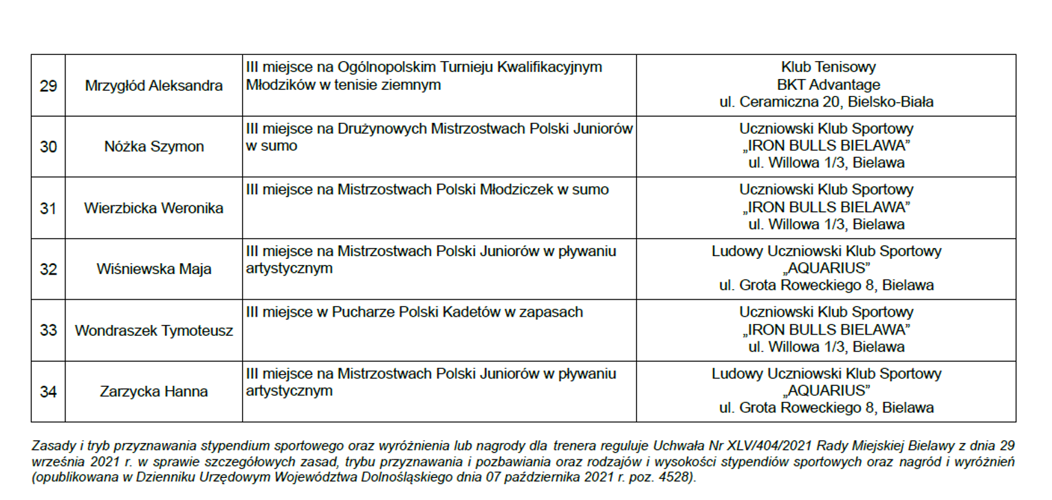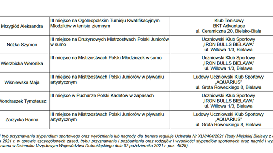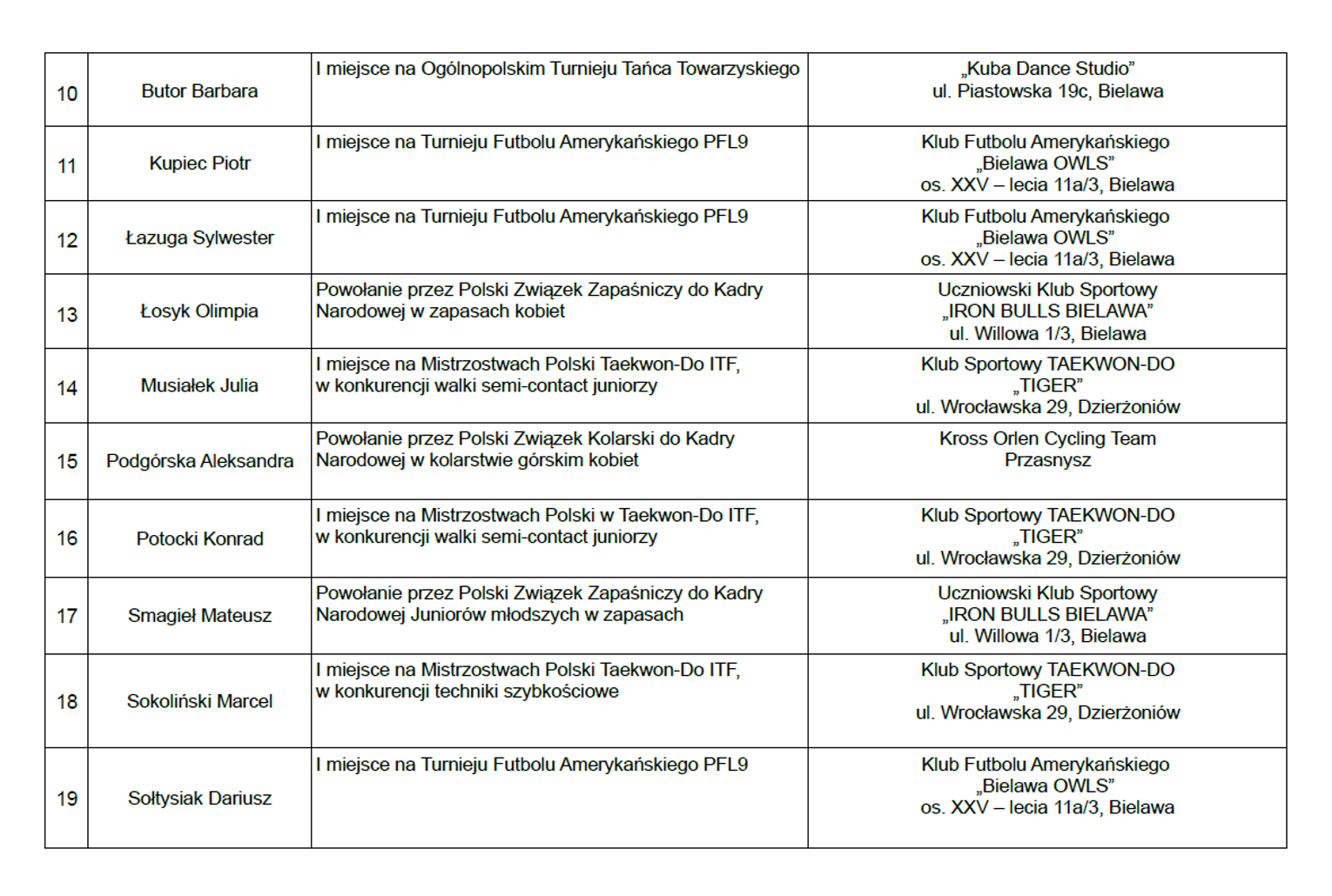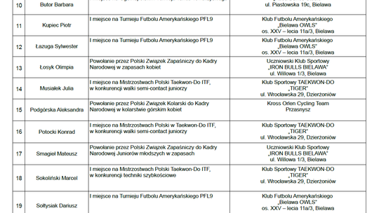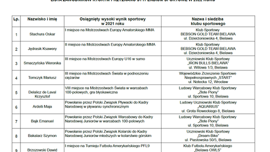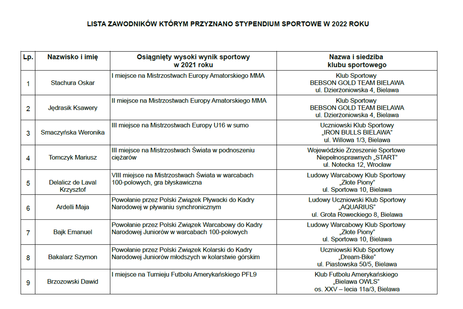 Ponad 93.000 złotych otrzymali w tym roku z budżetu gminy bielawscy sportowcy. Stypendia przyznane zostały trzydziestu czterem mieszkańcom naszego miasta, którzy w 2021 roku uzyskali wysokie wyniki sportowe w różnych dyscyplinach. Poniżej lista wyróżnionych zawodników.