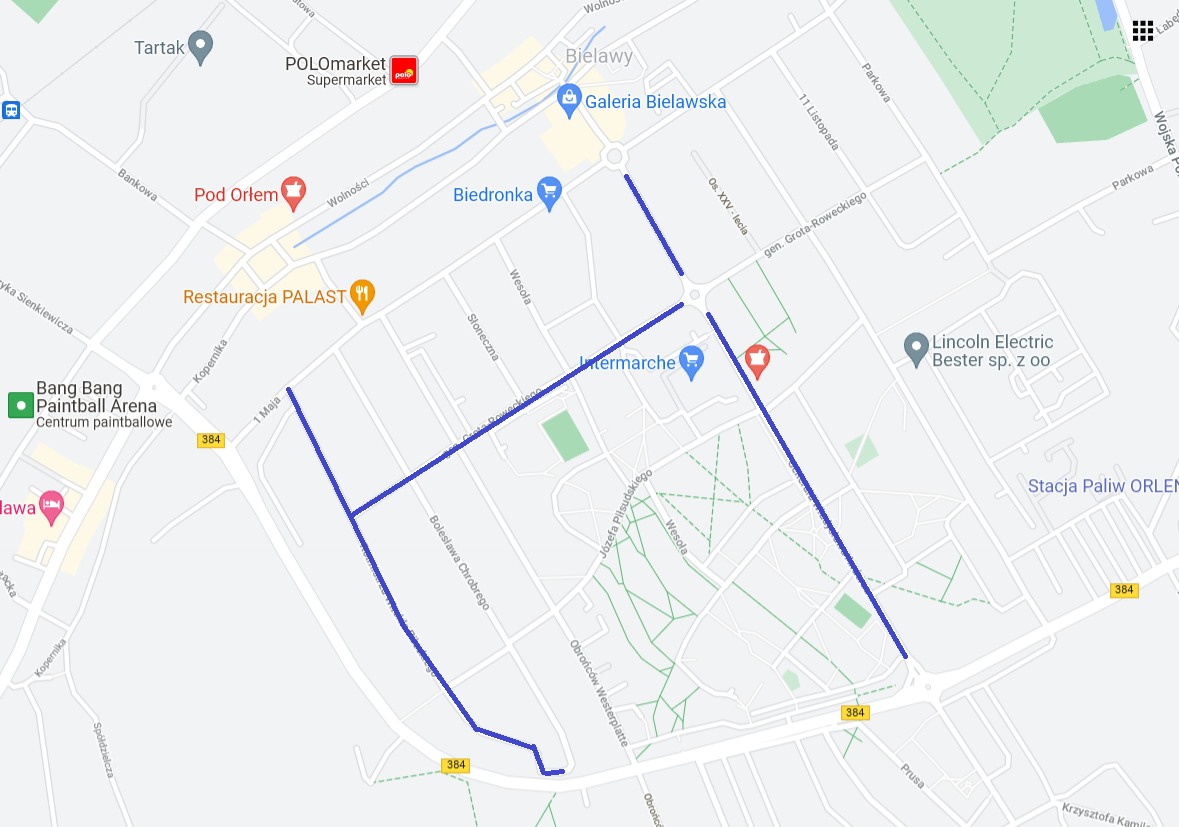 - na ul. rotm. W. Pileckiego pomiędzy ul. J. Piłsudskiego a B. Chrobrego