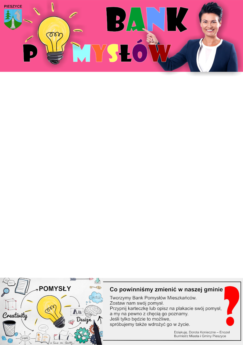 - To prosty i czytelny sposób, za pomocą którego każdy z Was może przedstawić swój pomysł na jeszcze lepszą gminę. Możecie to zrobić anonimowo, możecie się podpisać, ale nie musicie przychodzić na umówione spotkanie czy składać formalnych wniosków – zauważa Dorota Konieczna – Enozel – burmistrz Pieszyc. – Wiele pozytywnych działań udało nam się już podjąć i zrealizować, ale wiemy, że gmina to mieszkańcy i potrzeby są bardzo różne.