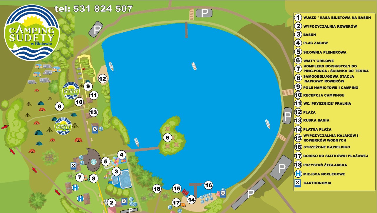 W efekcie, w pogodne dni, zarówno pole biwakowe, odkryty basen, jak i plaża nad Jeziorem Bielawskim, przeżywają swoiste oblężenie. Naturalnym jest, że zdecydowana większość osób wypoczywających nad bielawskim akwenem dociera tam własnym środkiem lokomocji. W okresie wakacji, z kąpieli słonecznych i wodnych w Bielawie korzysta w ciągu jednego dnia nawet ok. 3.000 osób. Dlatego też w sezonie letnim parkingi położone wokół Campingu "Sudety" "pękają w szwach".