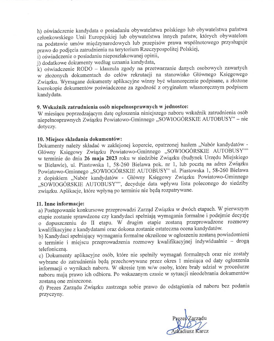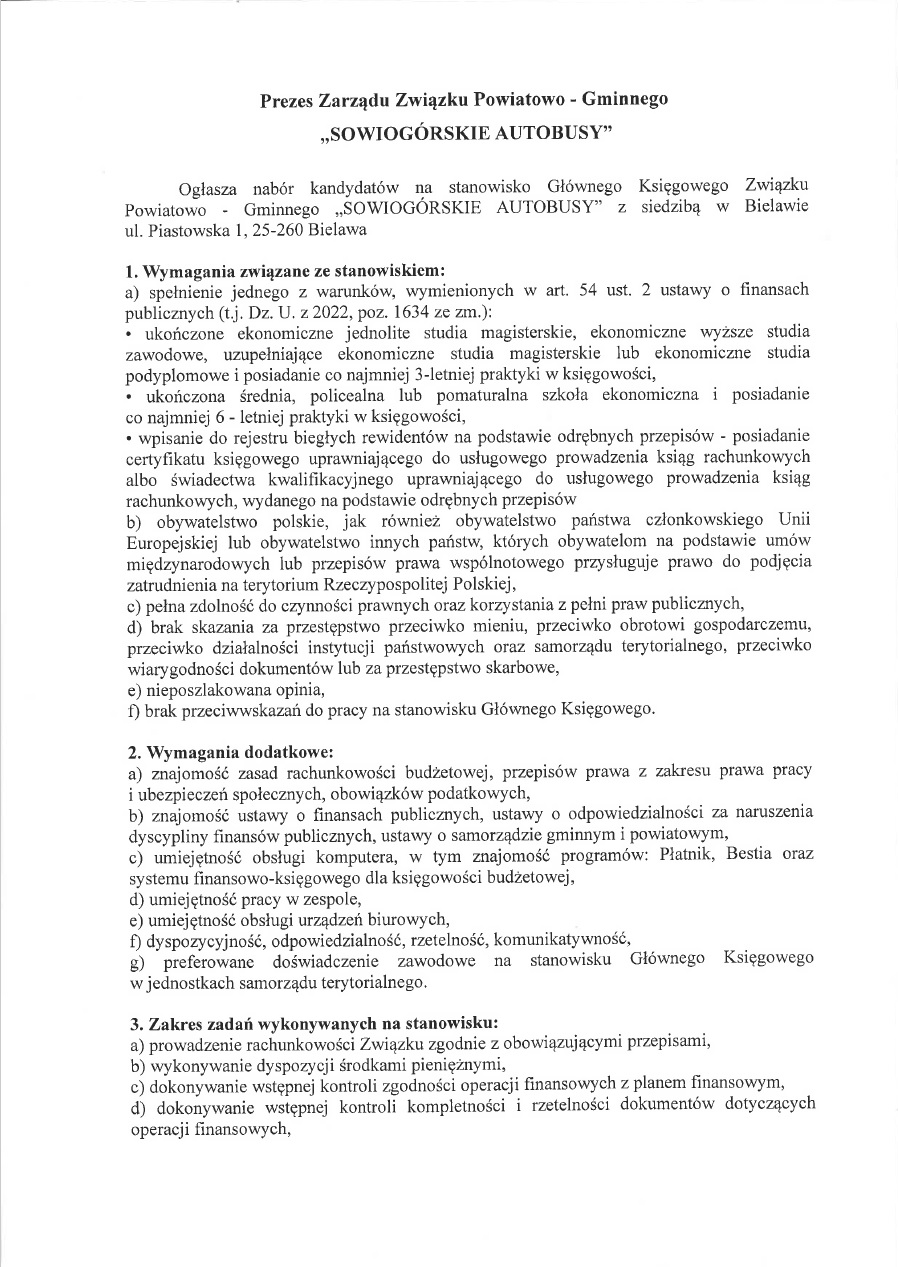 Prezes zarządu Związku Powiatowo-Gminnego „Sowiogórskie autobusty” ogłasza nabór kandydatów na stanowisko Głównego Księgowego Związku Powiatowo-Gminnego „Sowiogórskie Autobusy” z siedzibą w Bielawie przy ul. Piastowskiej 1.