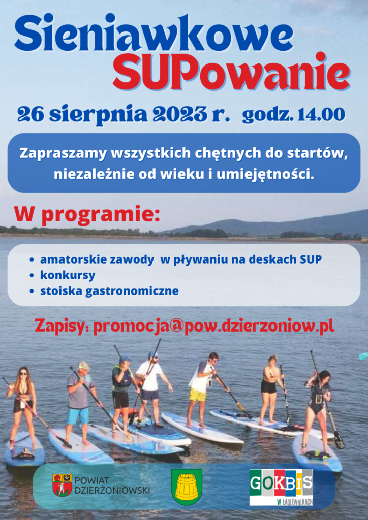 W ostatnią sobotę sierpnia na Stawie Trzcinowym w Sieniawce odbędą się pierwsze powiecie dzierżoniowskim zmagania na deskach SUP. Będzie to doskonała okazja do spróbowania swoich sił i odkrycia nowego sportu wodnego, który w ostatnim czasie cieszy się dużą popularnością.