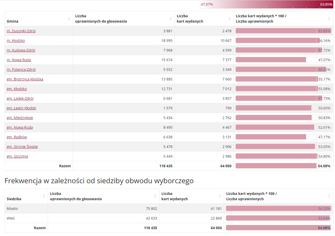 Państwowa Komisja Wyborcza podała frekwencje wyborczą na godzinę 17.00. W skali całego kraju wynosi ona 57,54%. Natomiast w powiecie kłodzkim 54,08% .
