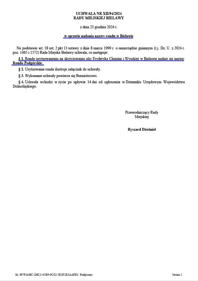 W uzasadnieniu do uchwały czytamy m.in., że nazwa ronda nawiązuje do jego położenia na os. Podgórskim, jest zwięzła, łatwa w posługiwaniu się i znaczeniowo neutralna. Przypominamy, że to już 12 rondo w Bielawie. Kolejne takie skrzyżowanie powstanie już wkrótce u zbiegu ulic H. Sienkiewicza, S. Żeromskiego i W. Grabskiego.