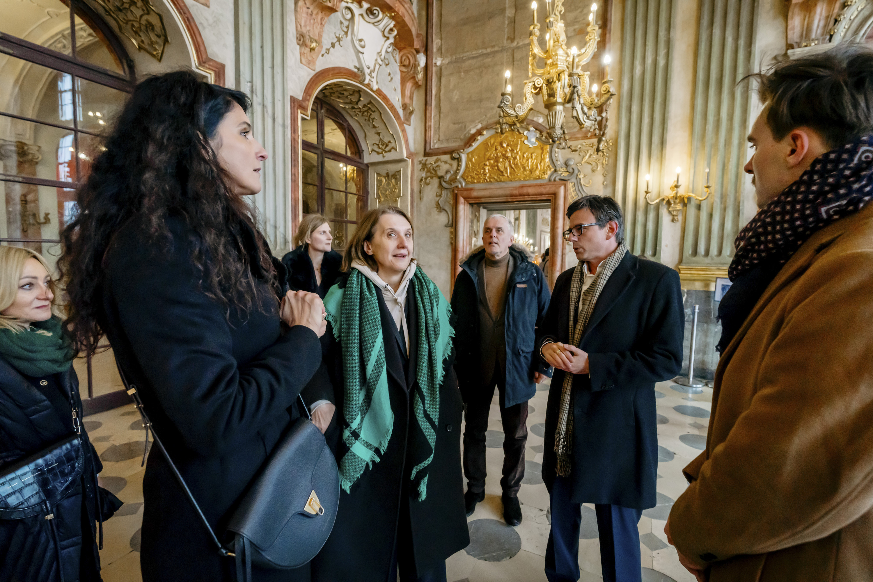 Podczas wizyty w Zamku Książ w Wałbrzychu ministrze kultury oprócz członkiń parlamentarnego zespołu ds. ratowania zabytków Dolnego Śląska (wicemarszałkini sejmu Monika Wielichowska, senator Barbara Zdrojewska oraz senator Agnieszka Kołacz-Leszczyńska) towarzyszyli wojewoda dolnośląska Anna Żabska (do listopada ubiegłego roku prezeska Zamku Książ) oraz wojewódzki konserwator zabytków Daniel Gibski. Delegację powitali w Zamku Książ prezydent Wałbrzycha, dr Roman Szełemej wraz z zastępca Kacprem Nogajczykiem, prezeska Zamku Książ Dorota Karolewska z prezesem Fundacji Księżnej Daisy von Pless, Mateuszem Mykytyszynem oraz posłanka Sylwia Bielawska.