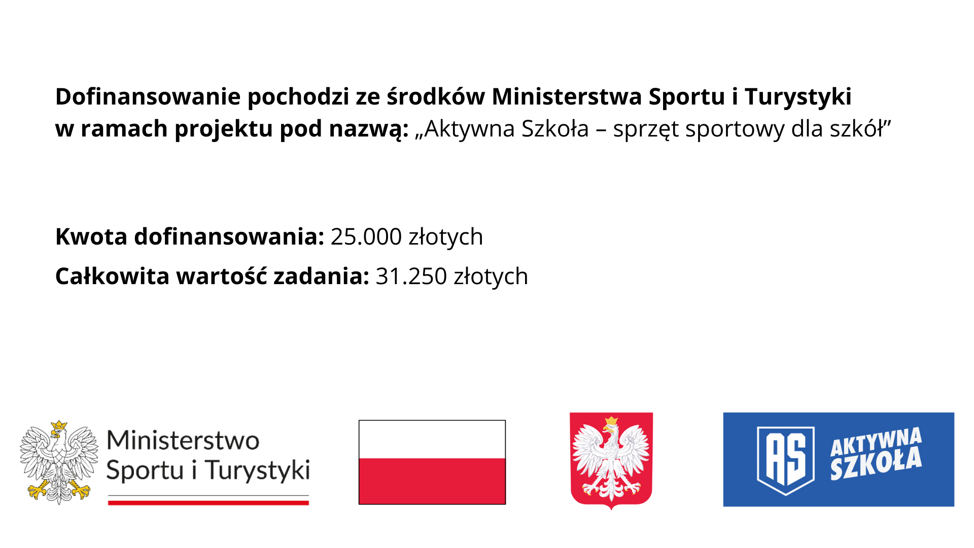 Całkowita wartość zadania wyniosła 31.250 złotych, a kwota dofinansowania to 25.000 złotych. Dofinansowanie pochodzi z programu MSiT „Aktywna Szkoła – sprzęt sportowy dla szkół”.