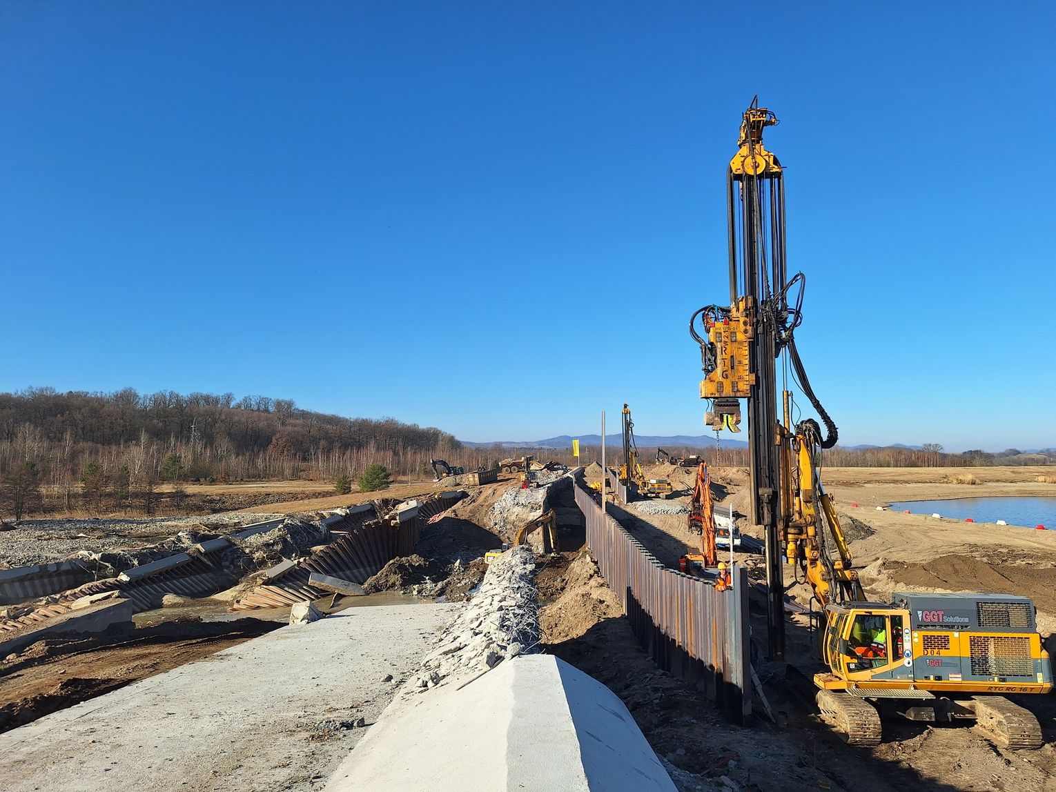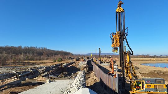 Obecnie wykonawca przygotowuje wykop pod montaż specjalnych grodzic wzmacniających konstrukcję. Dodatkowo, dla większej stabilności, zastosowane będą ściągi oraz ukośne wzmocnienia. Pracujemy nad przywróceniem pełnej funkcjonalności zbiornika, aby zapewnić bezpieczeństwo mieszkańcom i infrastrukturze. W bieżącym tygodniu planowana jest kontynuacja prac. Na miejscu cały czas pracuje ciężki sprzęt wraz z obsługą – koparki, palownice, dźwigi, wozidła, podnośniki i walec.