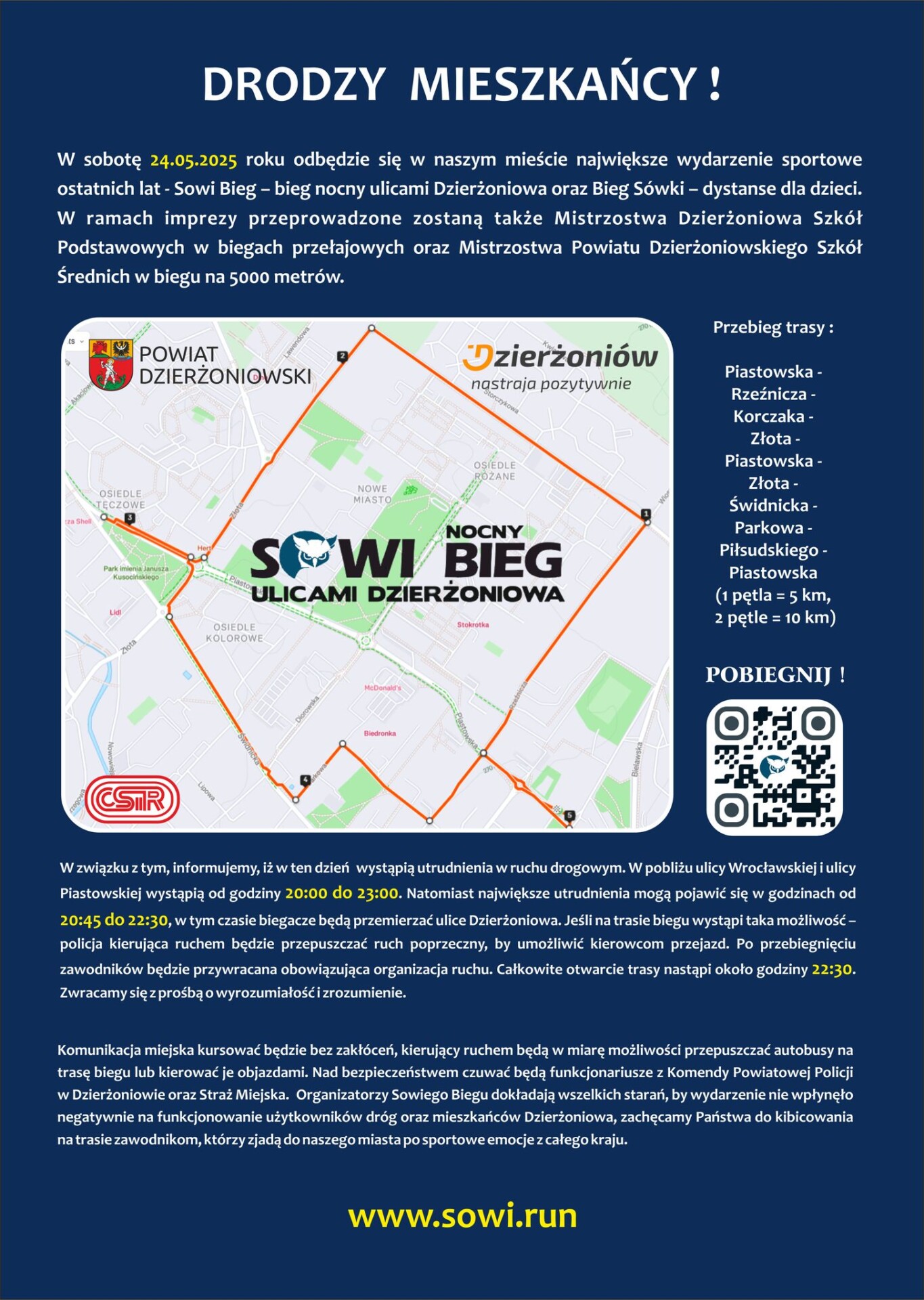 24 maja w Dzierżoniowie, w związku z odbywającym się Sowim Biegiem, pojawią się utrudnienia w ruchu drogowym. Zachęcamy do zapoznania się z informacją.