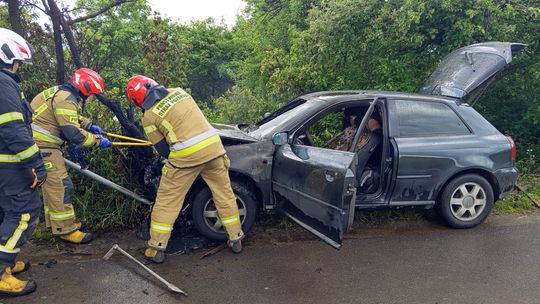 31 maja przed godziną 13:00 dyżurny stanowiska kierowania PSP w Dzierżoniowie otrzymał zgłoszenie o wypadku samochodu osobowego na ul. Polnej w Ostroszowicach. Na miejsce zadysponowano zastęp Państwowej Straży Pożarnej z Dzierżoniowa, zastęp Ochotniczej Straży Pożarnej z Ostroszowic oraz policję. Na miejscu okazało się że kierowca Audi na łuku drogi stracił panowanie nad pojazdem, uderzył w ogrodzenie, drzewo i znak drogowy. W pojeździe doszło do pożaru. Kierujący uciekł z miejsca zdarzenia. Strażacy przy pomocy dwóch prądów wody ugasili pojazd. Według świadków nietrzeźwy kierowca został zatrzymany w Ostroszowicach.