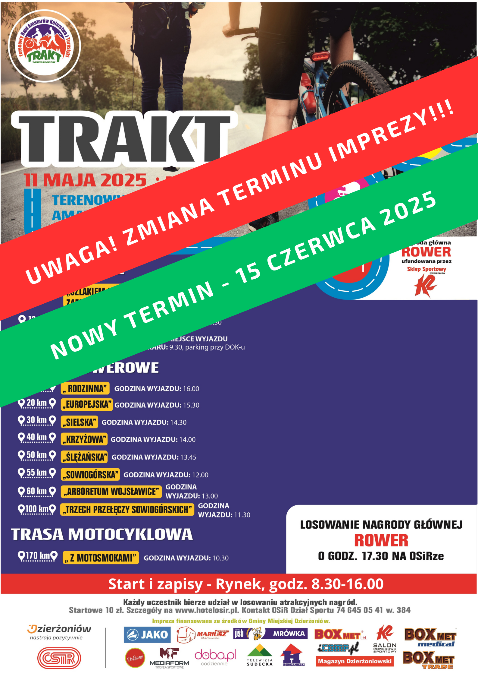 Na trasy wyruszymy z dzierżoniowskiego rynku (wyjątkiem jest trasa piesza Sowiogórska - wyjazd z parkingu przy DOK-u). Uczestnicy TRAKT-u spotkają się na mecie ustawionej na terenie Ośrodka Sportu i Rekreacji, gdzie o godzinie 17.30 odbędzie się losowanie roweru ufundowanego przez sklep K2 oraz innych nagród. Nie zabraknie też tradycyjnego poczęstunku, a dla najmłodszych - dmuchańców.