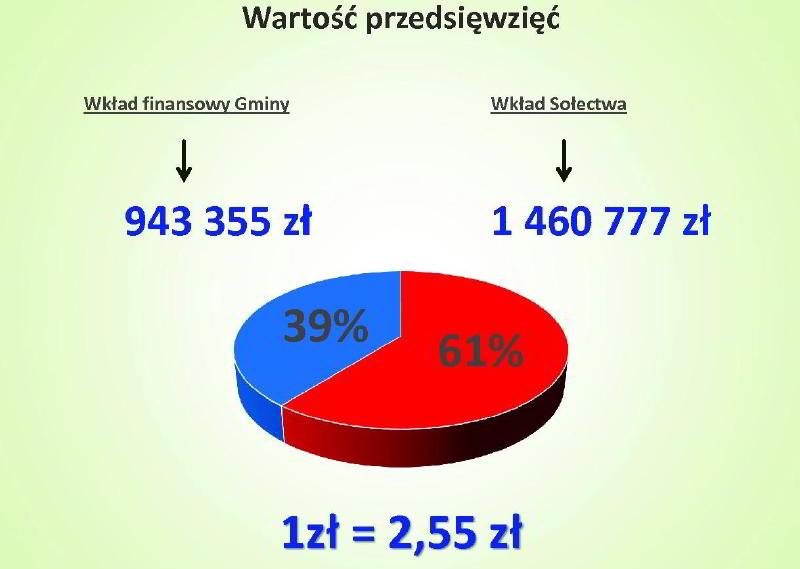 Przez czternaście lat łączna wartość przedsięwzięć osiągnęła 26 330 021 zł. Sołectwa angażujące się na poziomie 65% wartości inwestycji, do 9 259 423 zł, jakie przeznaczyła gmina, dołożyły w sumie 17 070 598 zł.