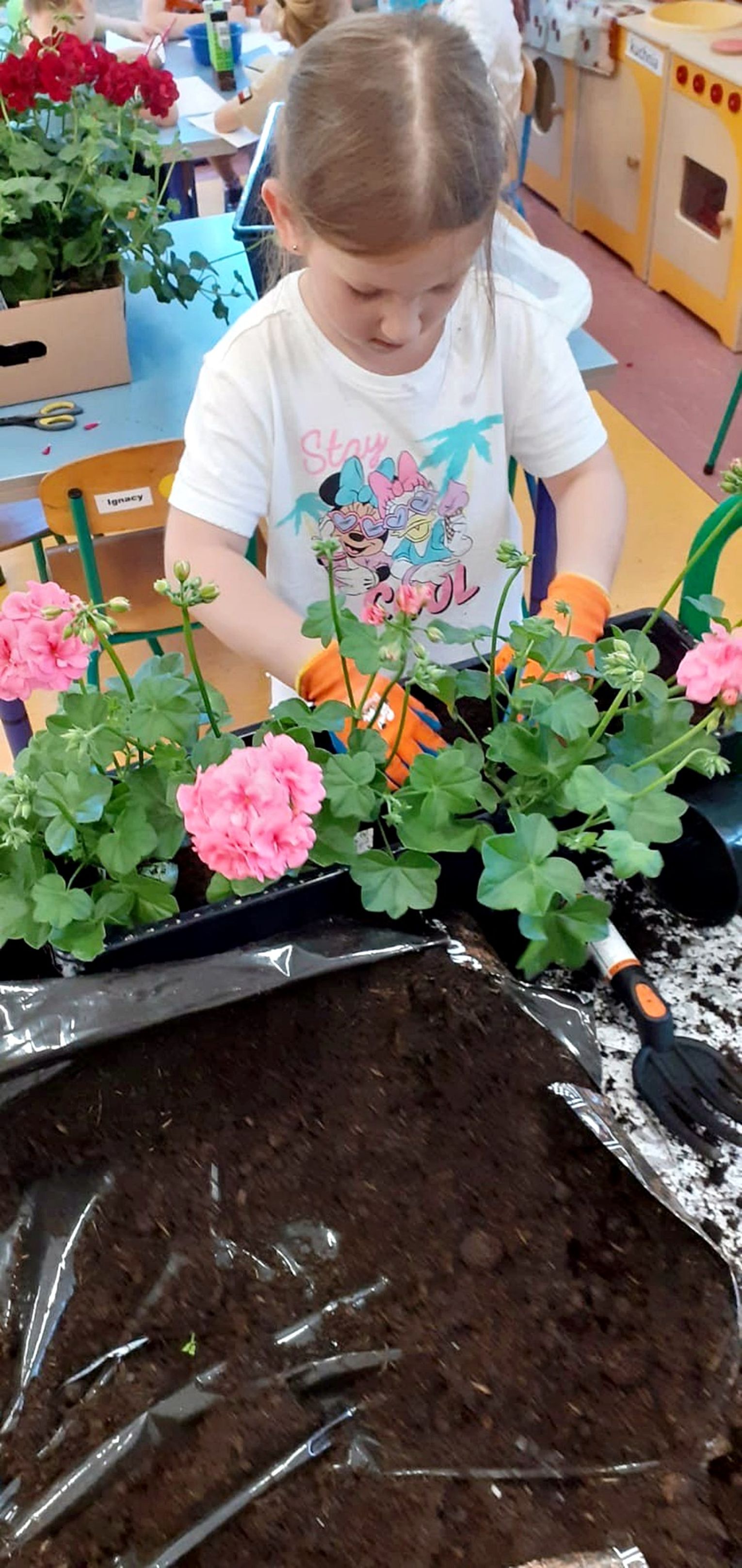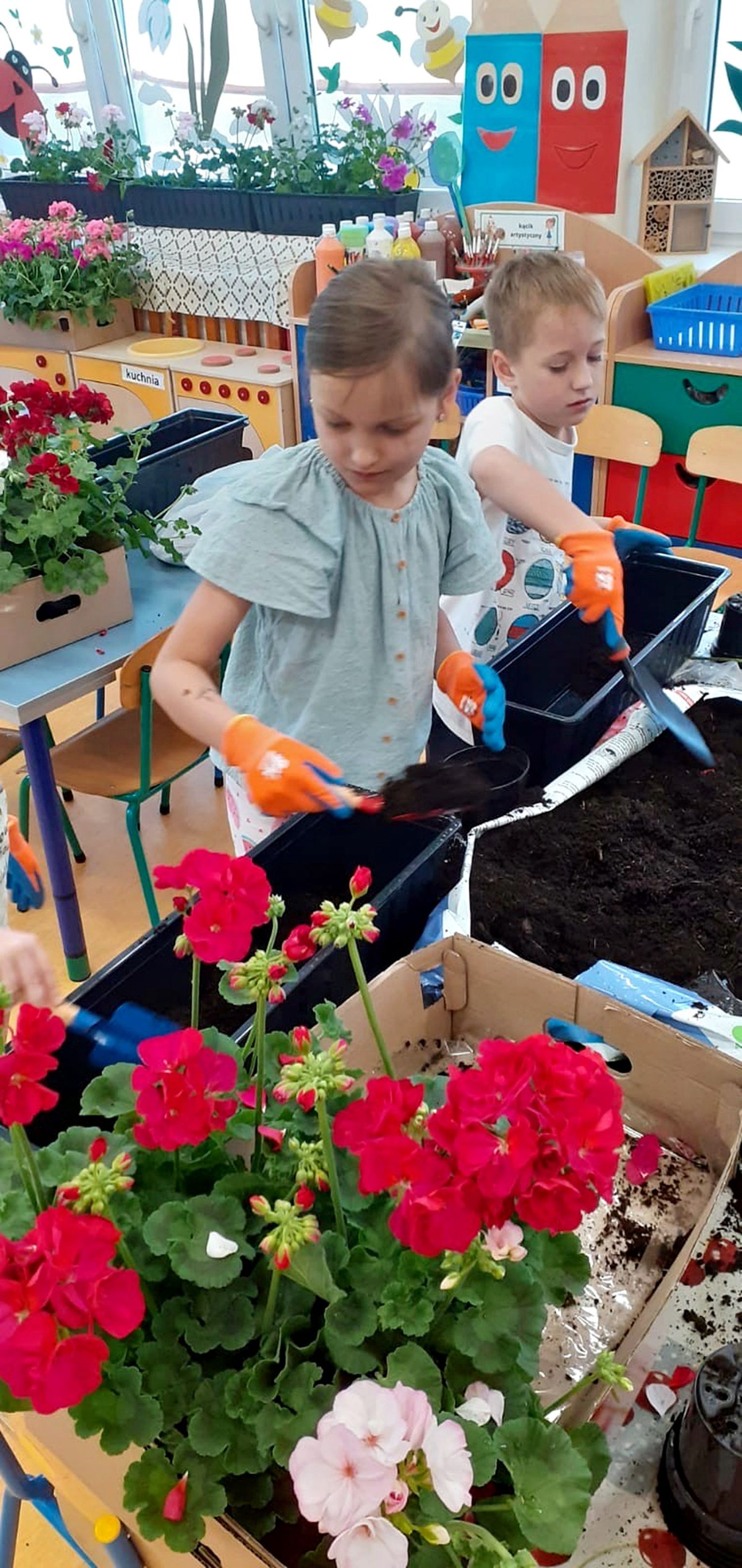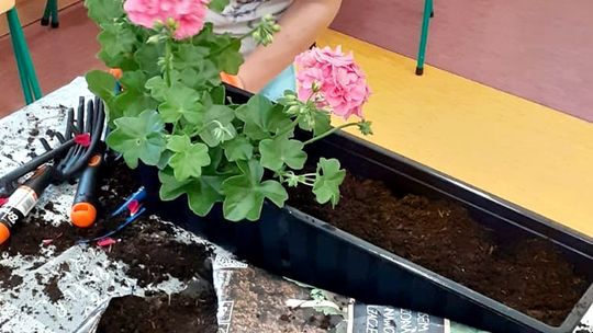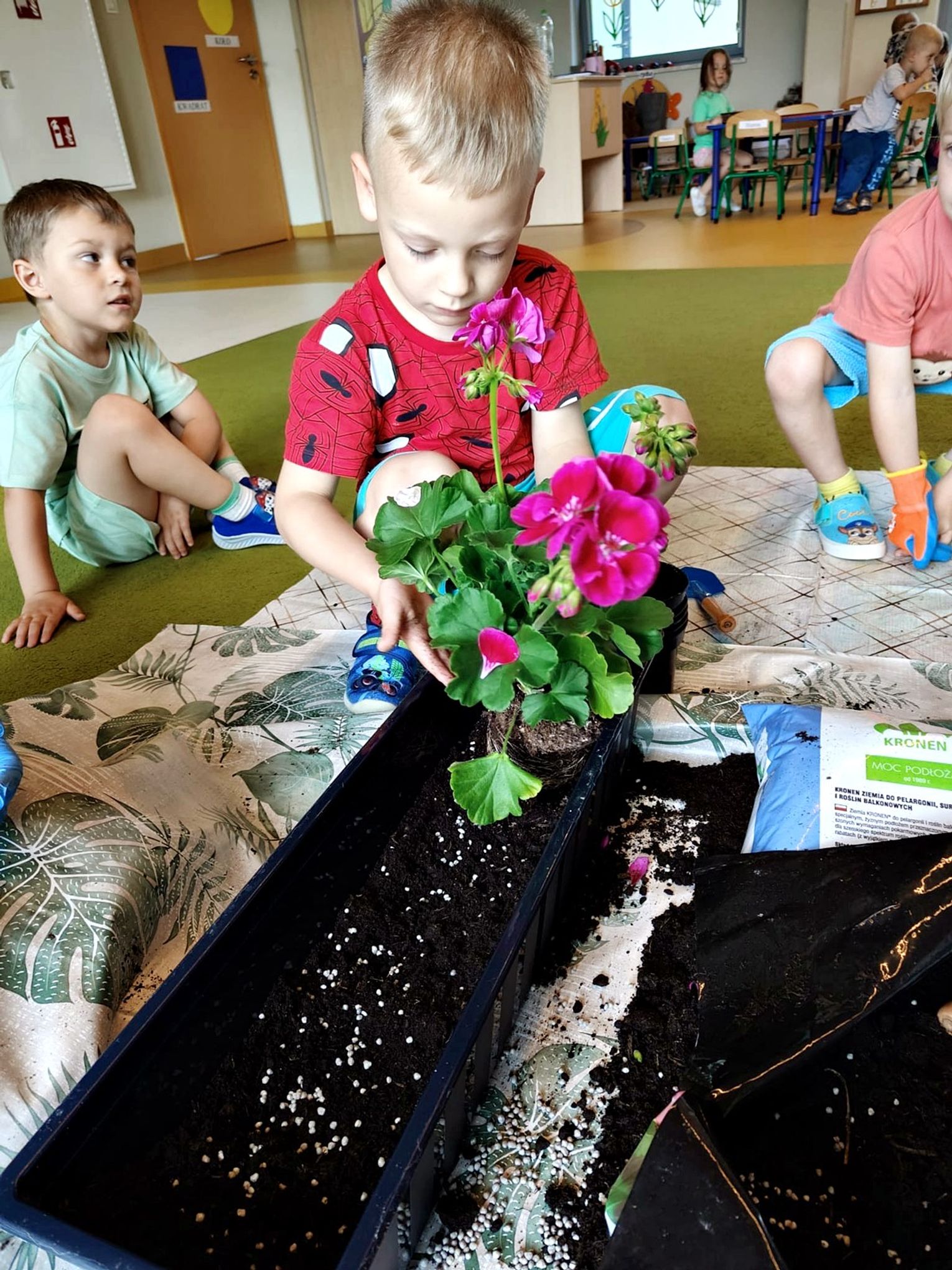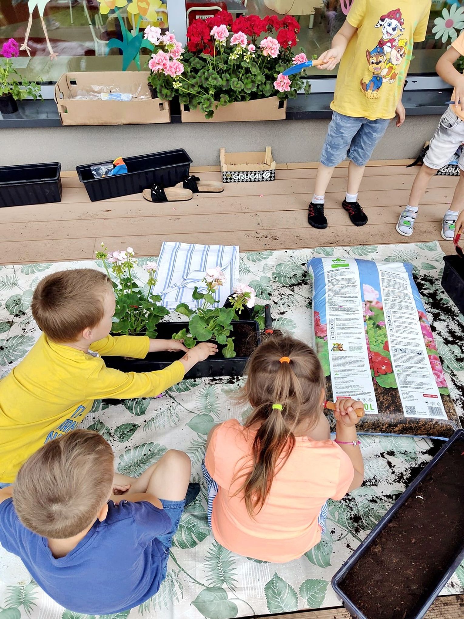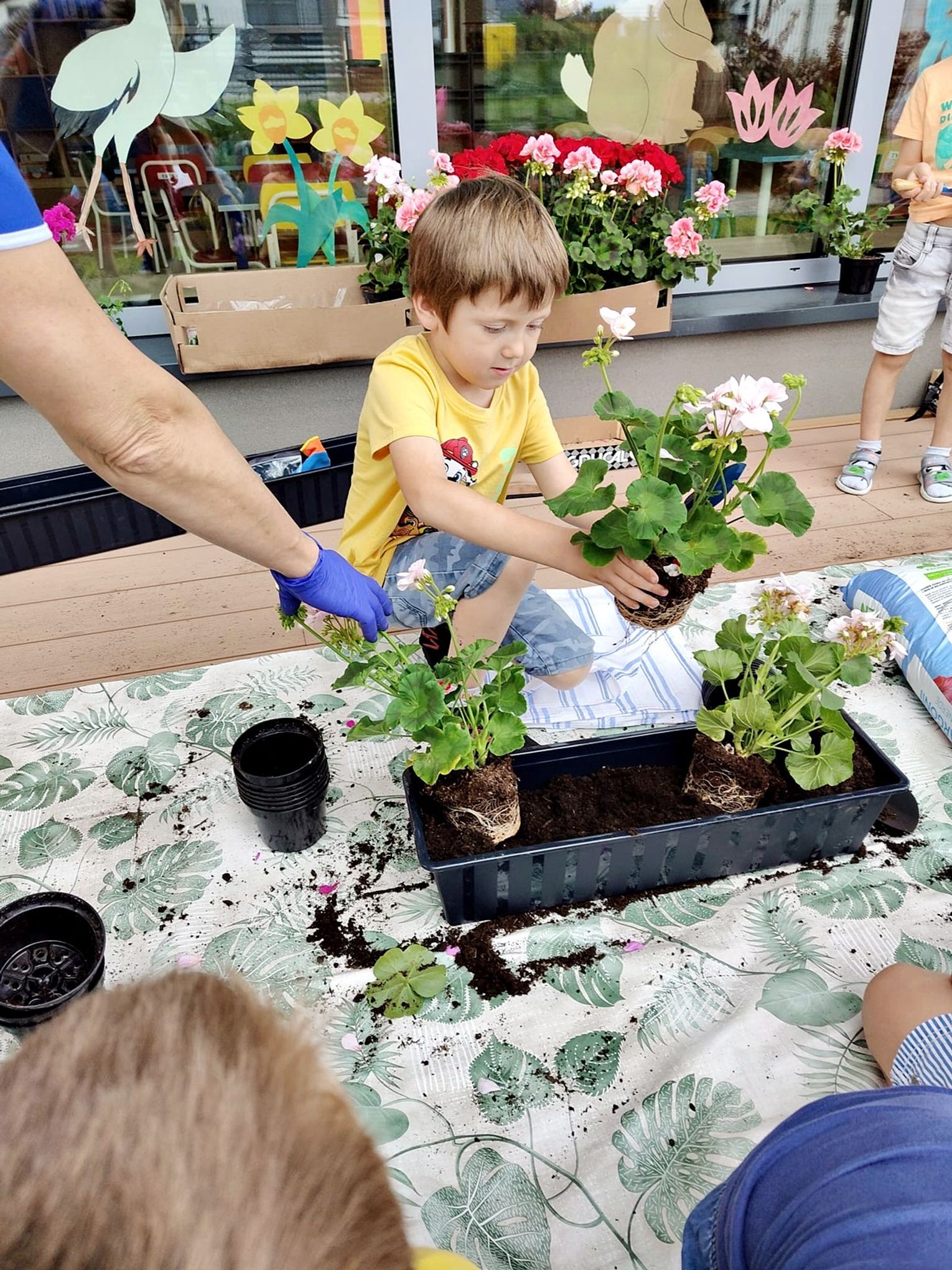 Dzieci z zaangażowaniem wybierały rośliny, przygotowywały donice i skrzynki, wsypywały ziemię, a następnie sadziły wybrane gatunki. Wśród kwiatów znalazły się m.in. pelargonie. Podczas zajęć dzieci utrwalały sobie również zasady podlewania i pielęgnacji roślin doniczkowych – wiedzą już, że rośliny potrzebują regularnej opieki, ale nie należy ich przelewać.