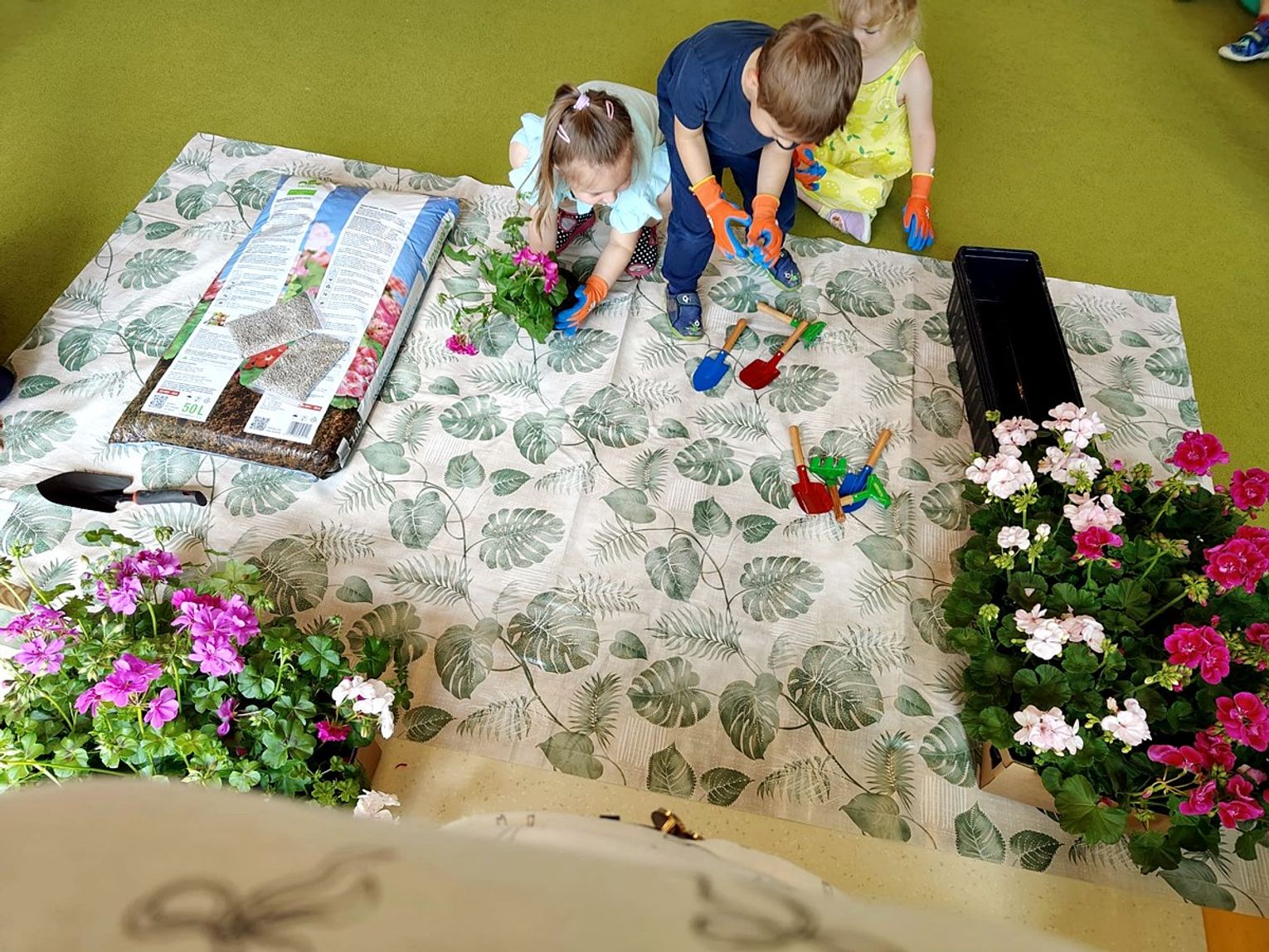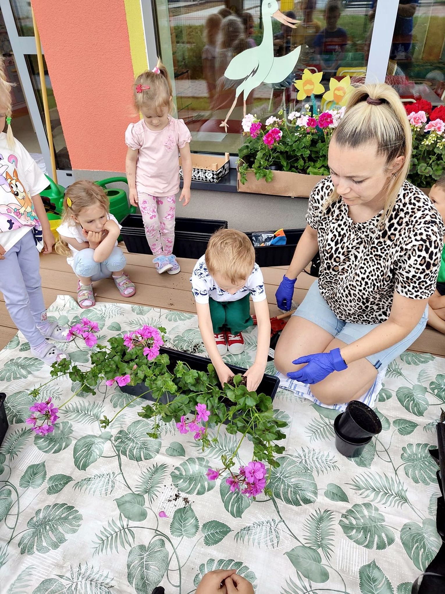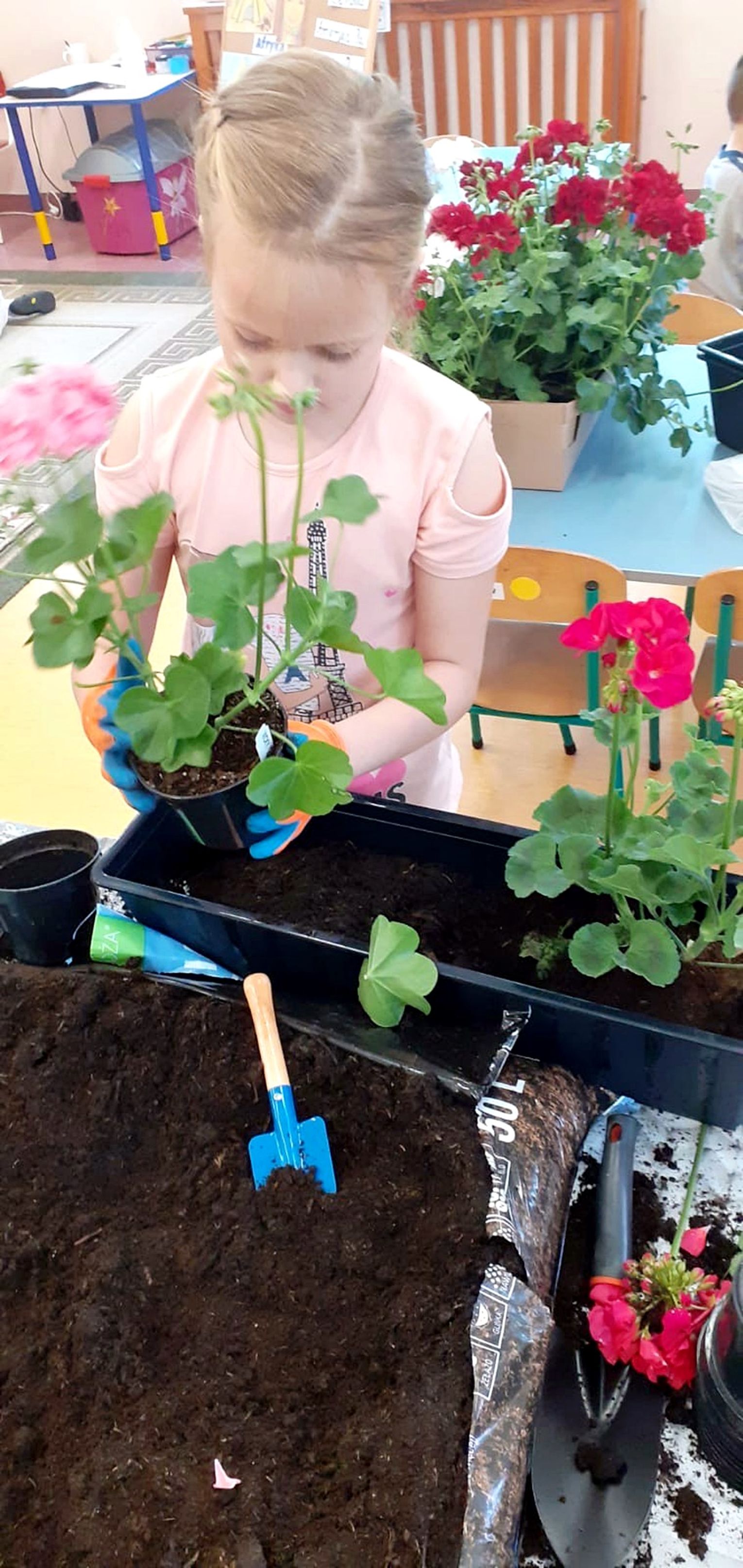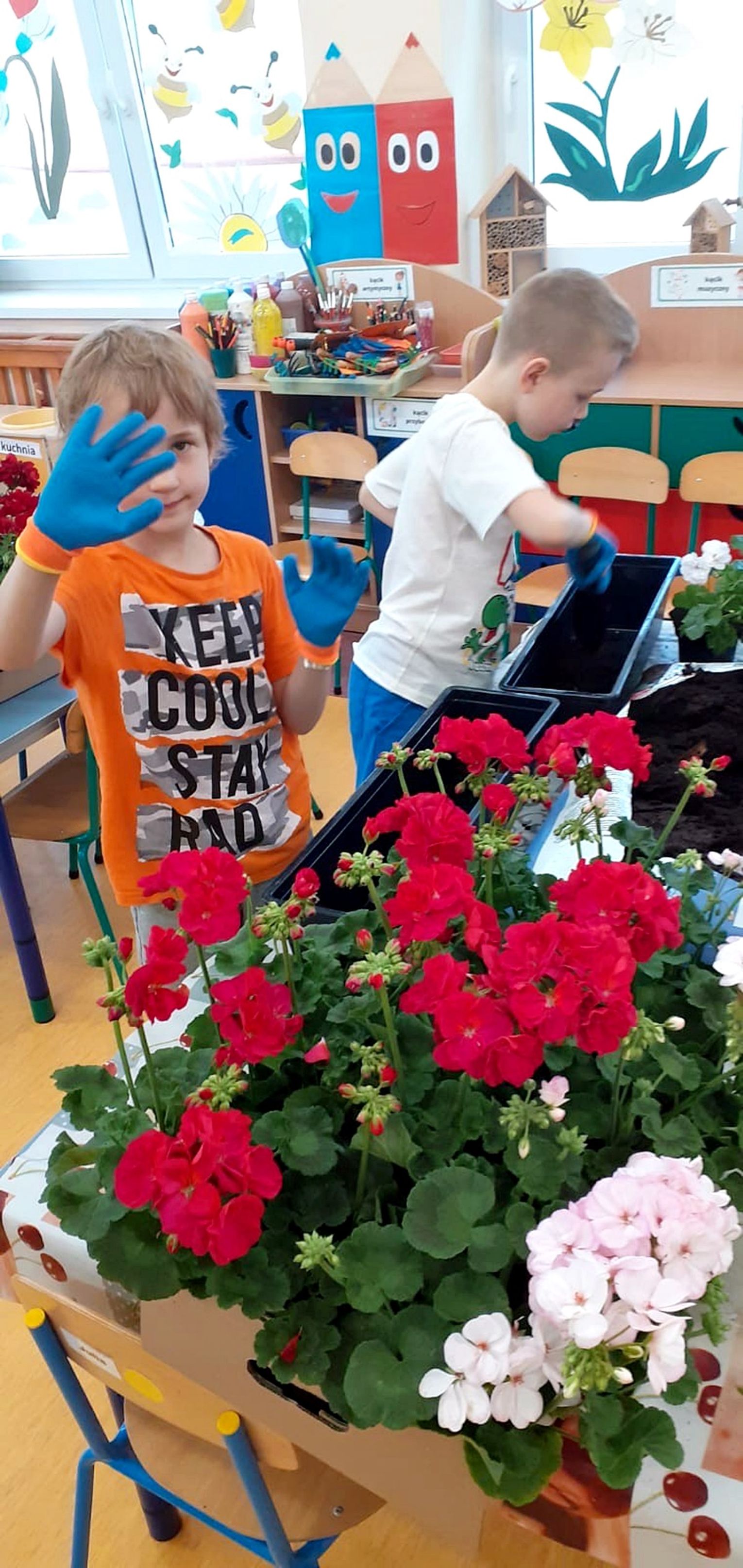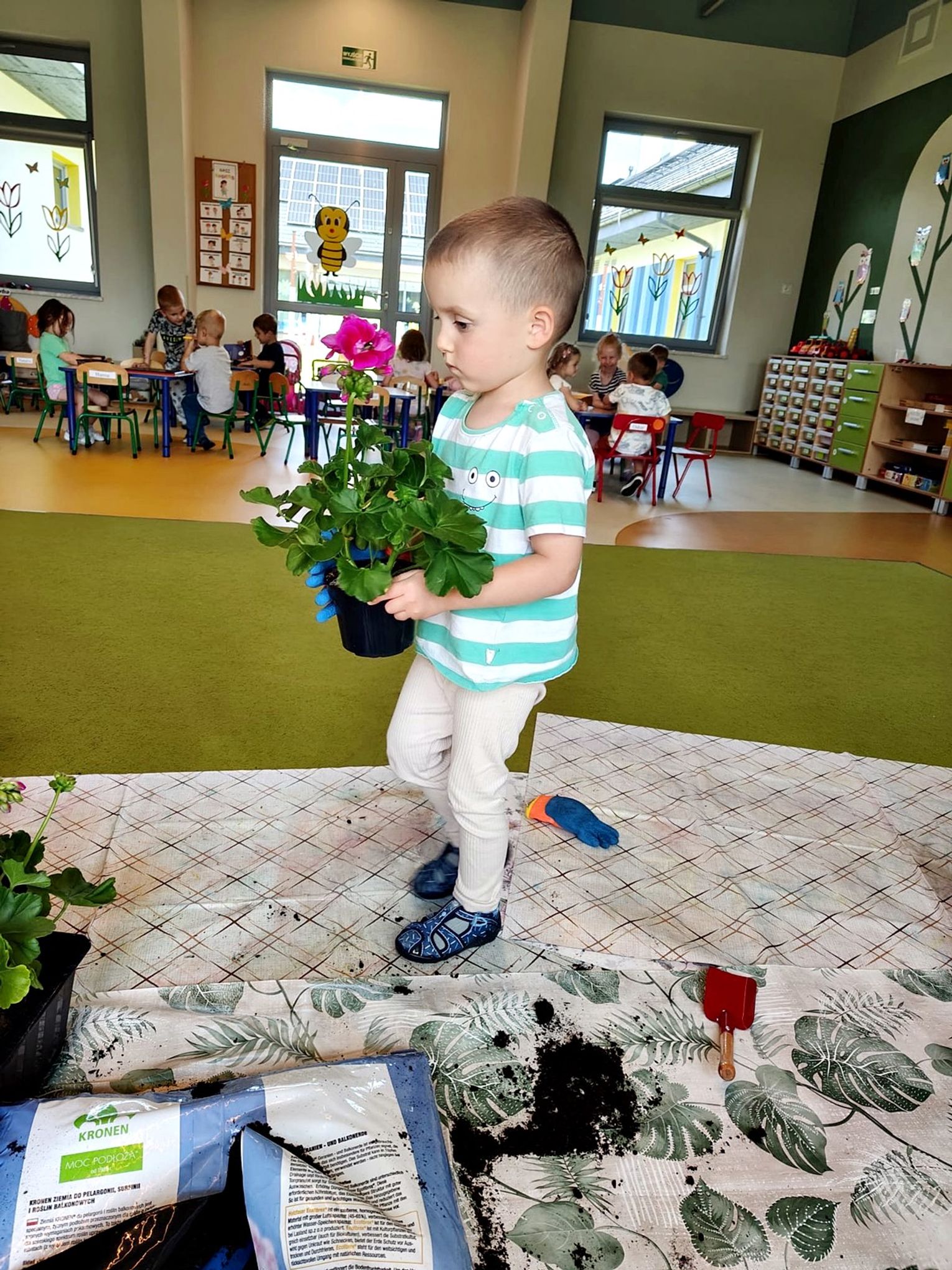 Dzieci z zaangażowaniem wybierały rośliny, przygotowywały donice i skrzynki, wsypywały ziemię, a następnie sadziły wybrane gatunki. Wśród kwiatów znalazły się m.in. pelargonie. Podczas zajęć dzieci utrwalały sobie również zasady podlewania i pielęgnacji roślin doniczkowych – wiedzą już, że rośliny potrzebują regularnej opieki, ale nie należy ich przelewać.