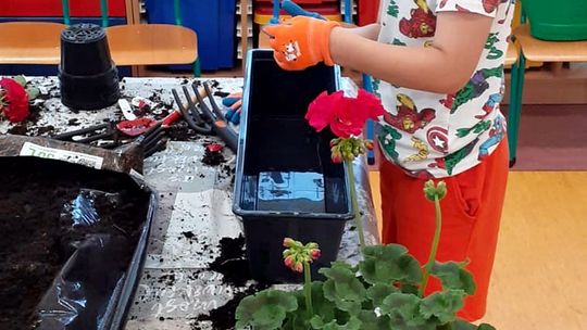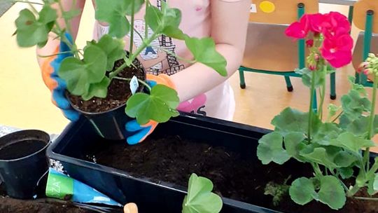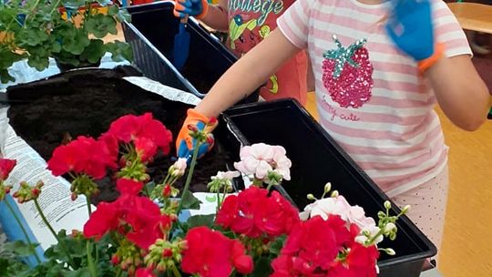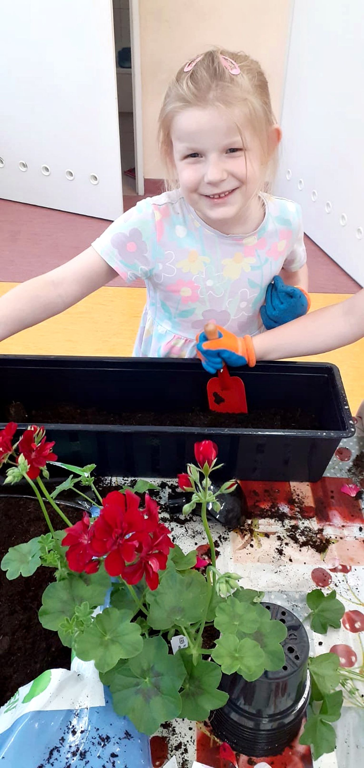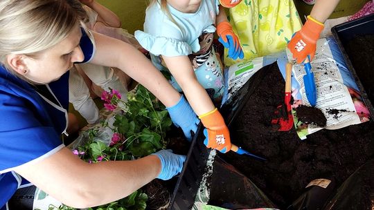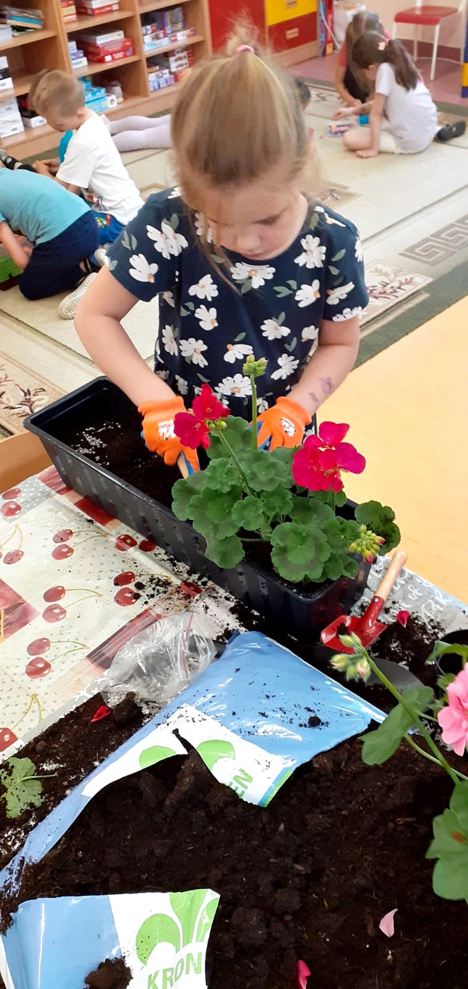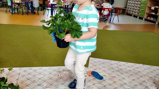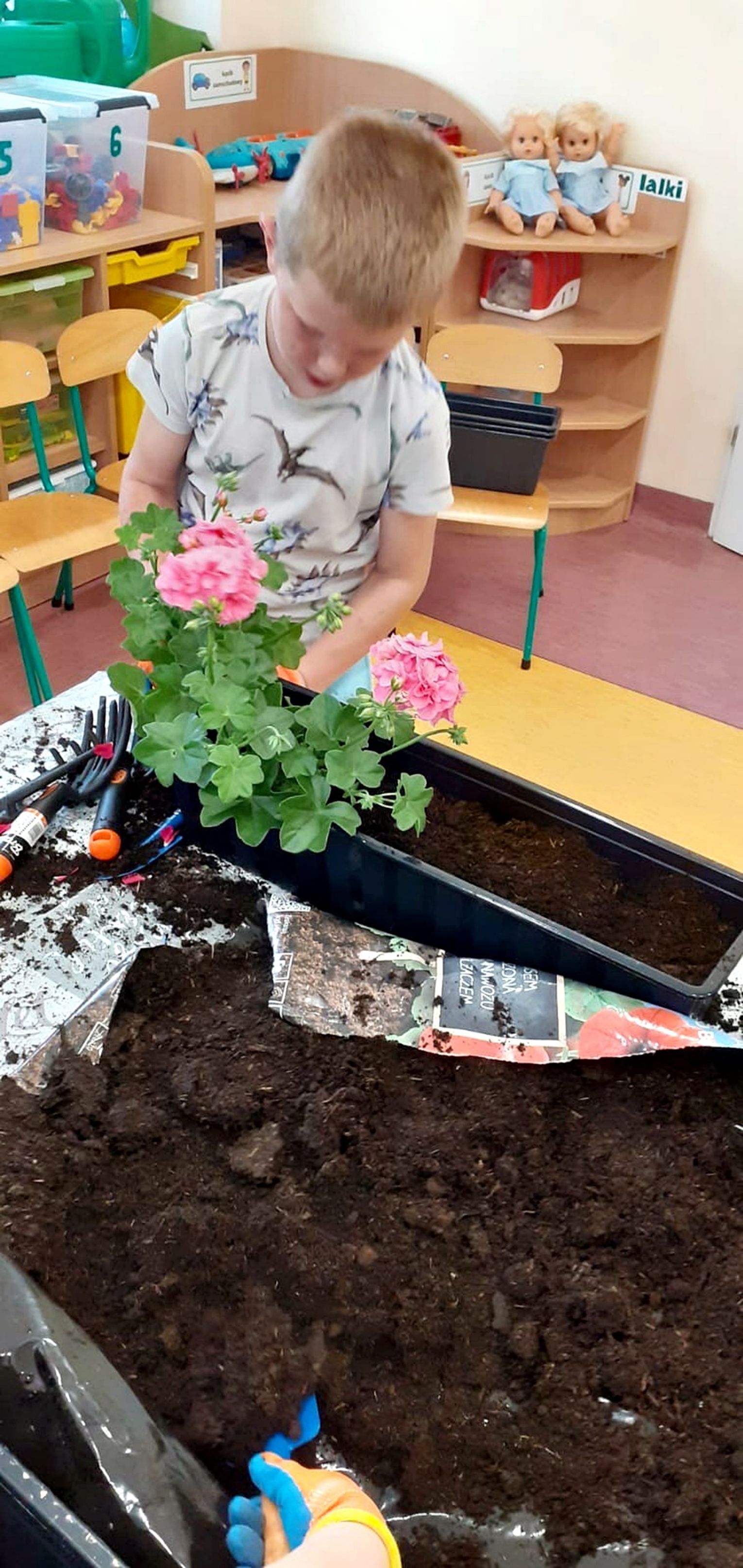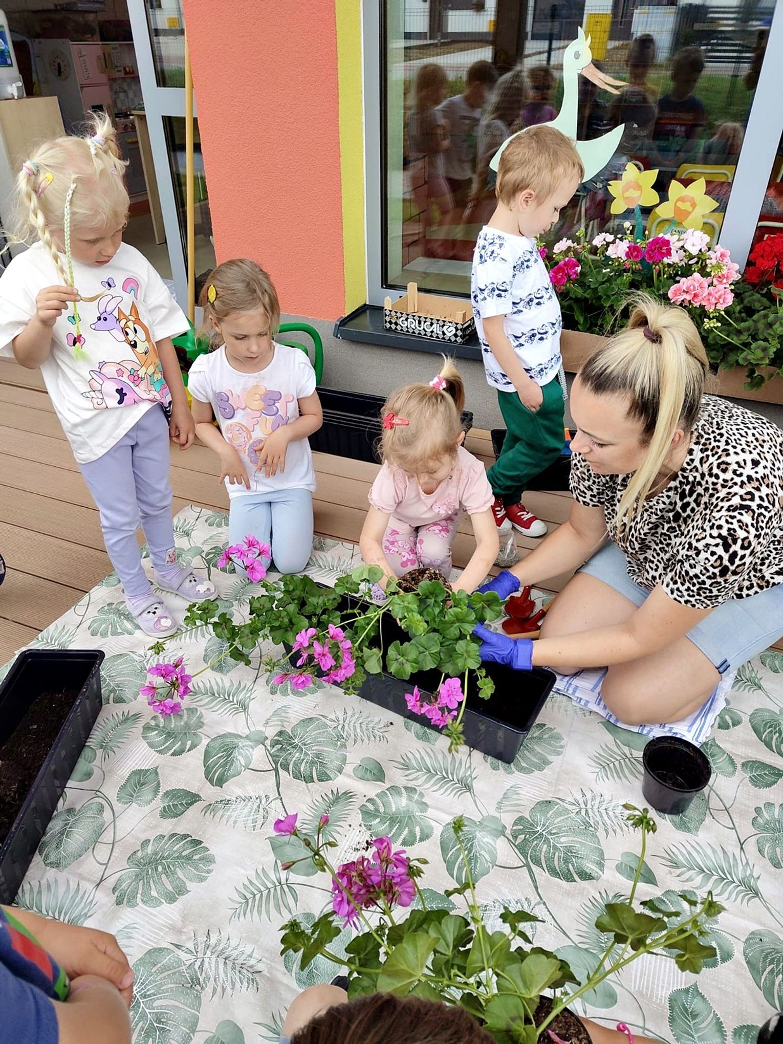 Dzieci z zaangażowaniem wybierały rośliny, przygotowywały donice i skrzynki, wsypywały ziemię, a następnie sadziły wybrane gatunki. Wśród kwiatów znalazły się m.in. pelargonie. Podczas zajęć dzieci utrwalały sobie również zasady podlewania i pielęgnacji roślin doniczkowych – wiedzą już, że rośliny potrzebują regularnej opieki, ale nie należy ich przelewać.