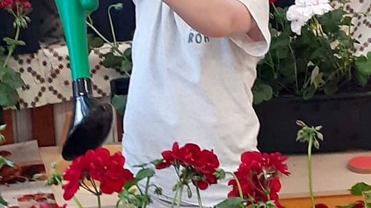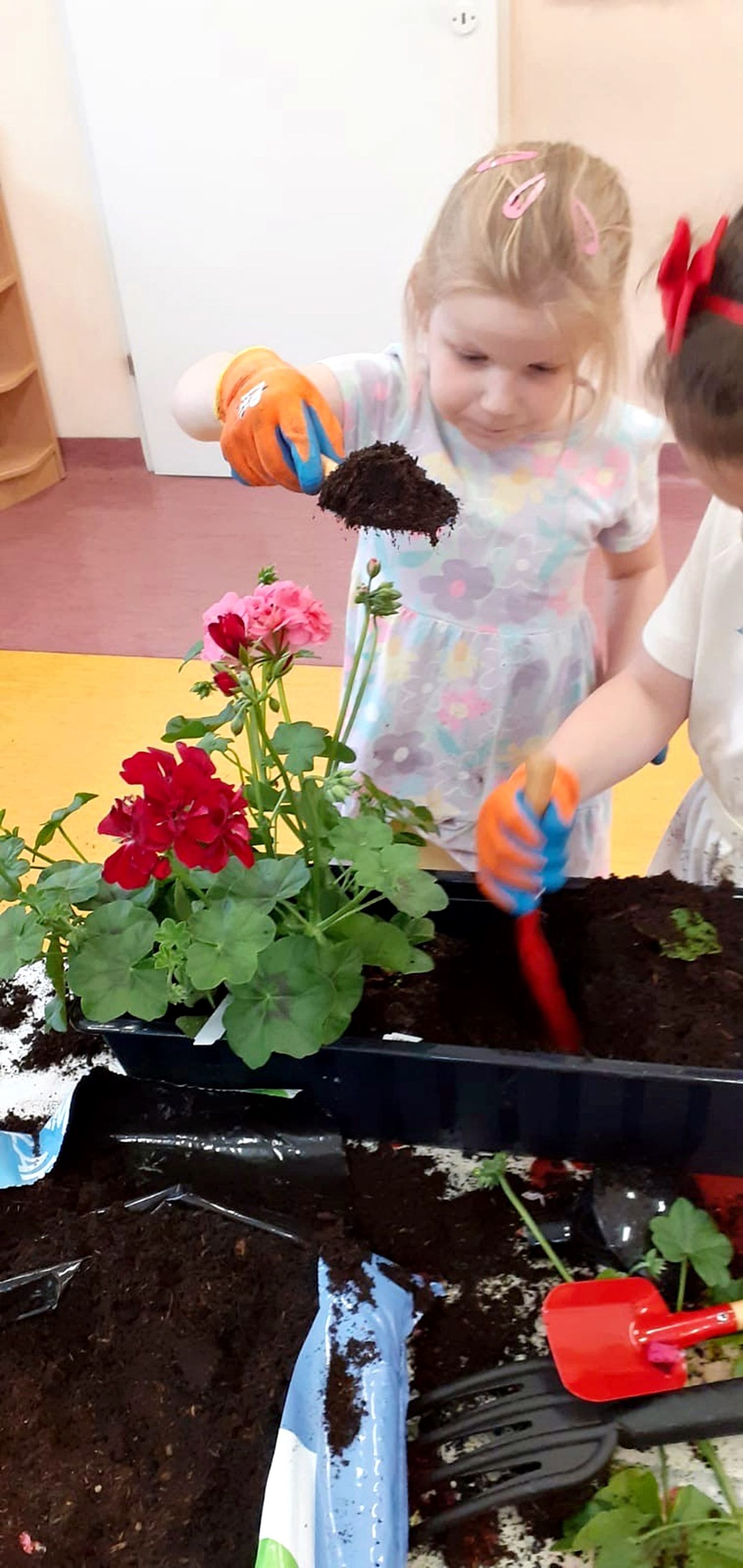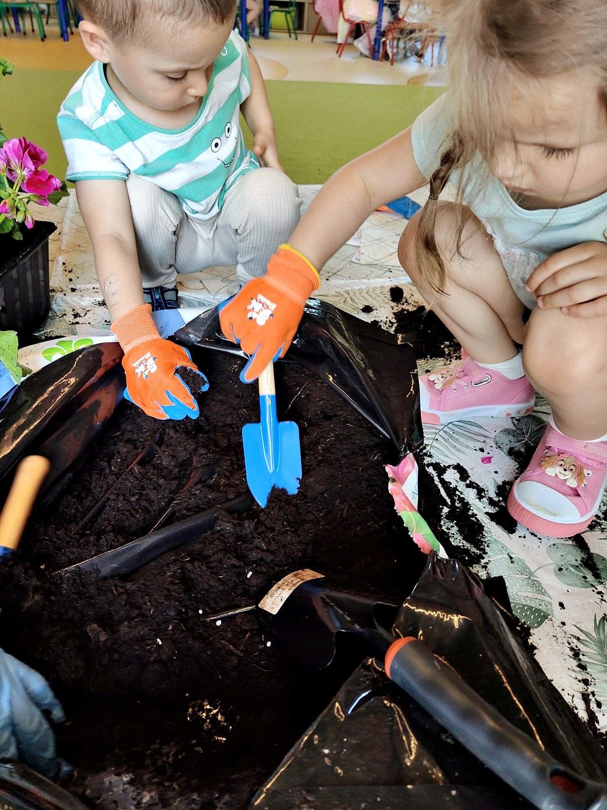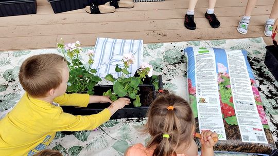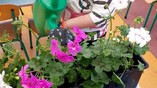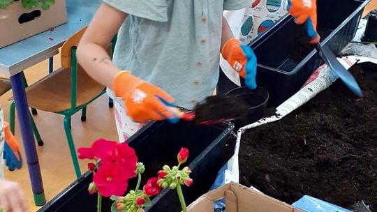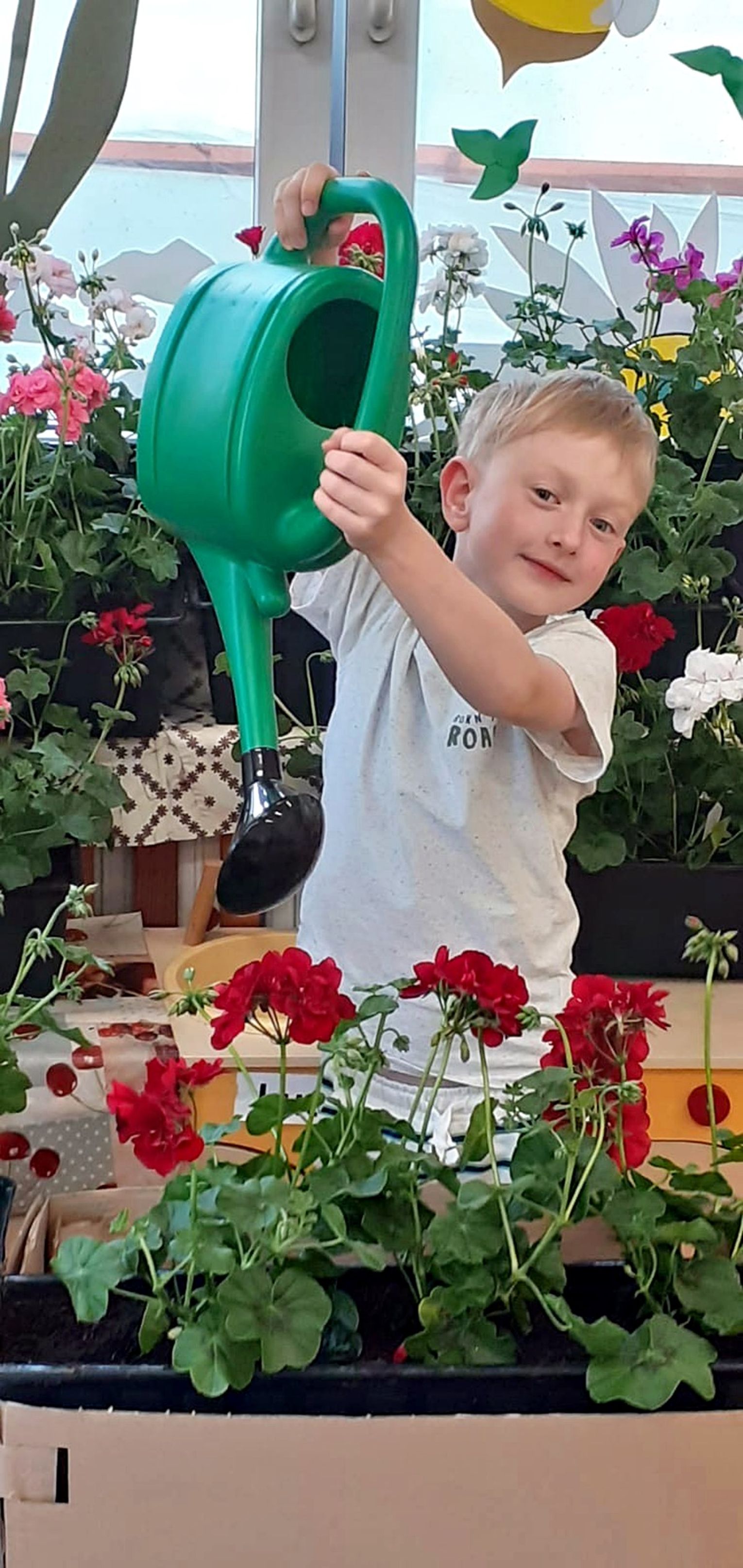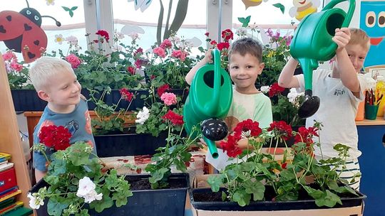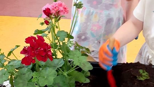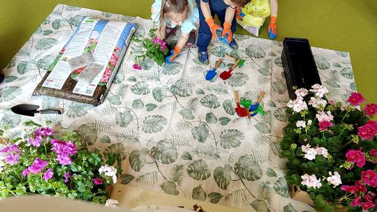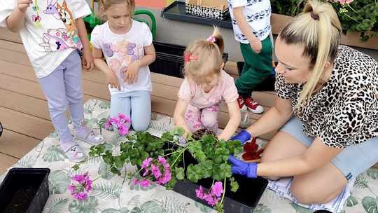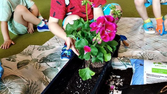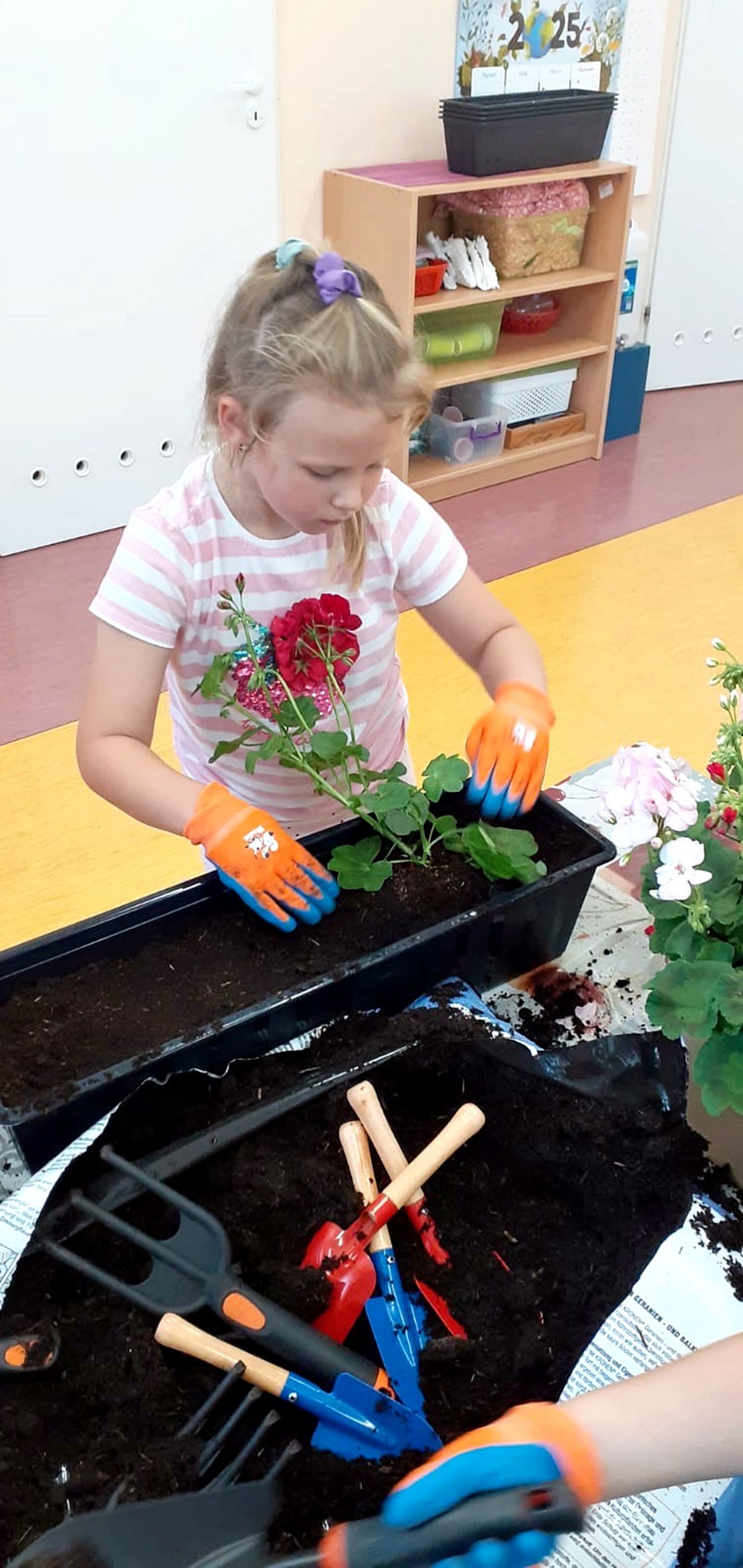 Dzieci z zaangażowaniem wybierały rośliny, przygotowywały donice i skrzynki, wsypywały ziemię, a następnie sadziły wybrane gatunki. Wśród kwiatów znalazły się m.in. pelargonie. Podczas zajęć dzieci utrwalały sobie również zasady podlewania i pielęgnacji roślin doniczkowych – wiedzą już, że rośliny potrzebują regularnej opieki, ale nie należy ich przelewać.
