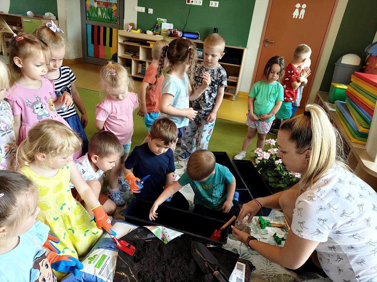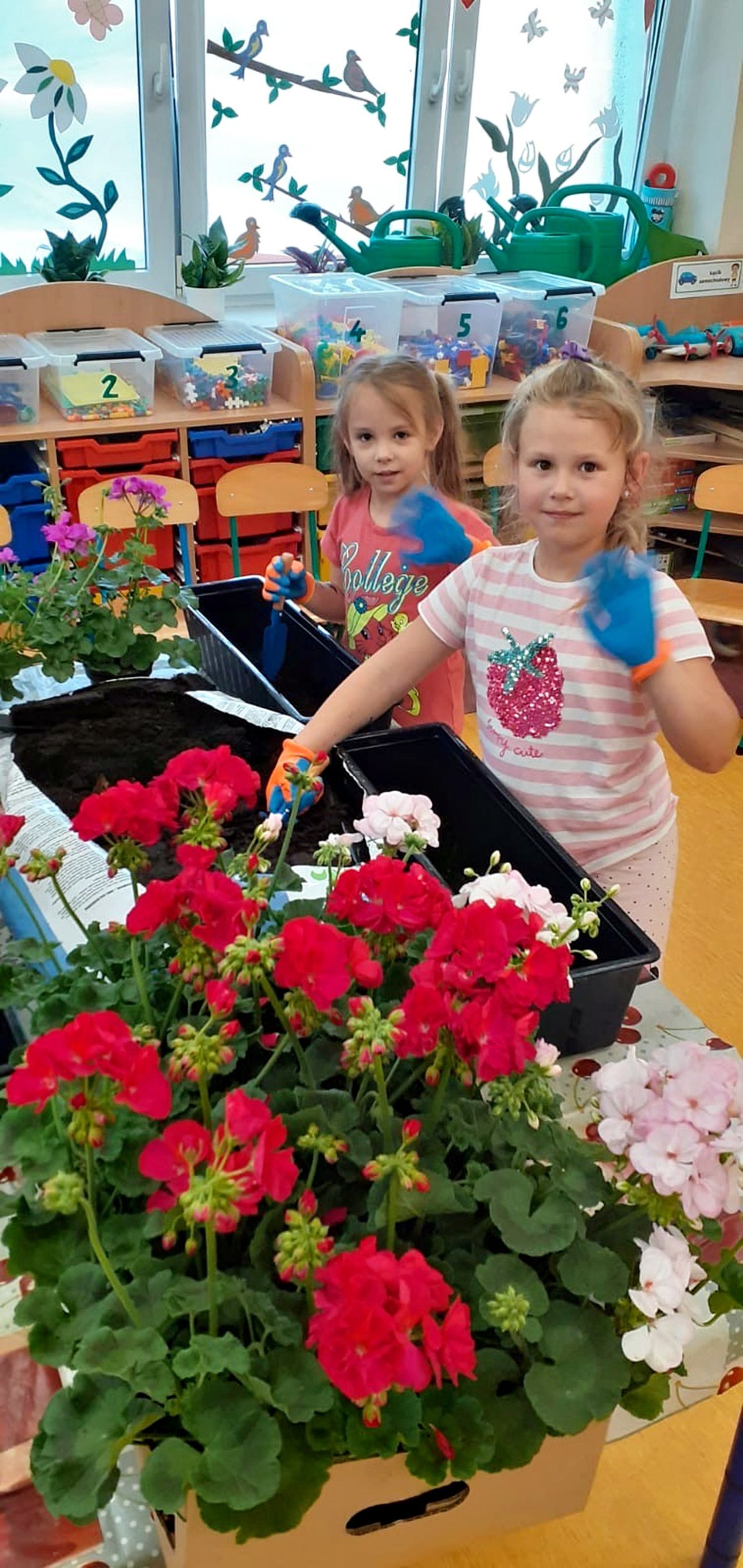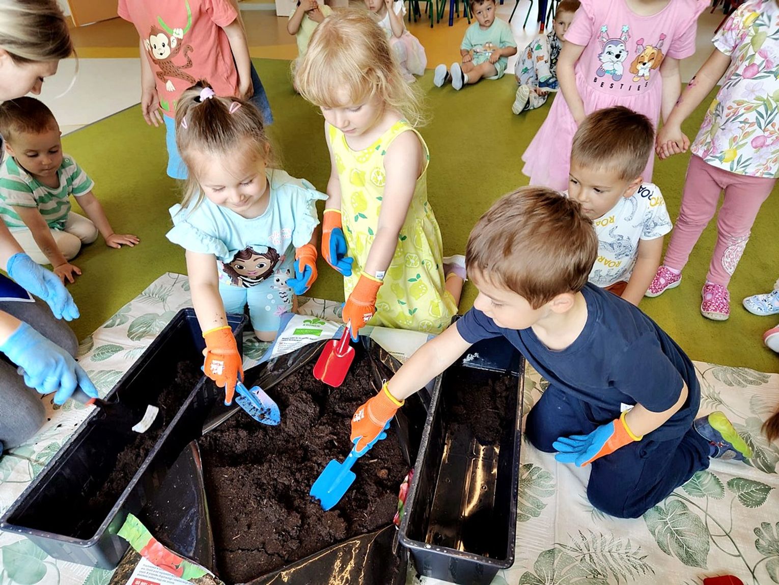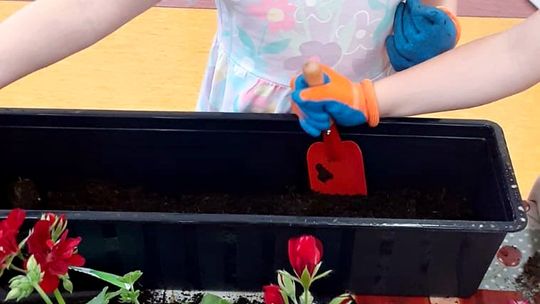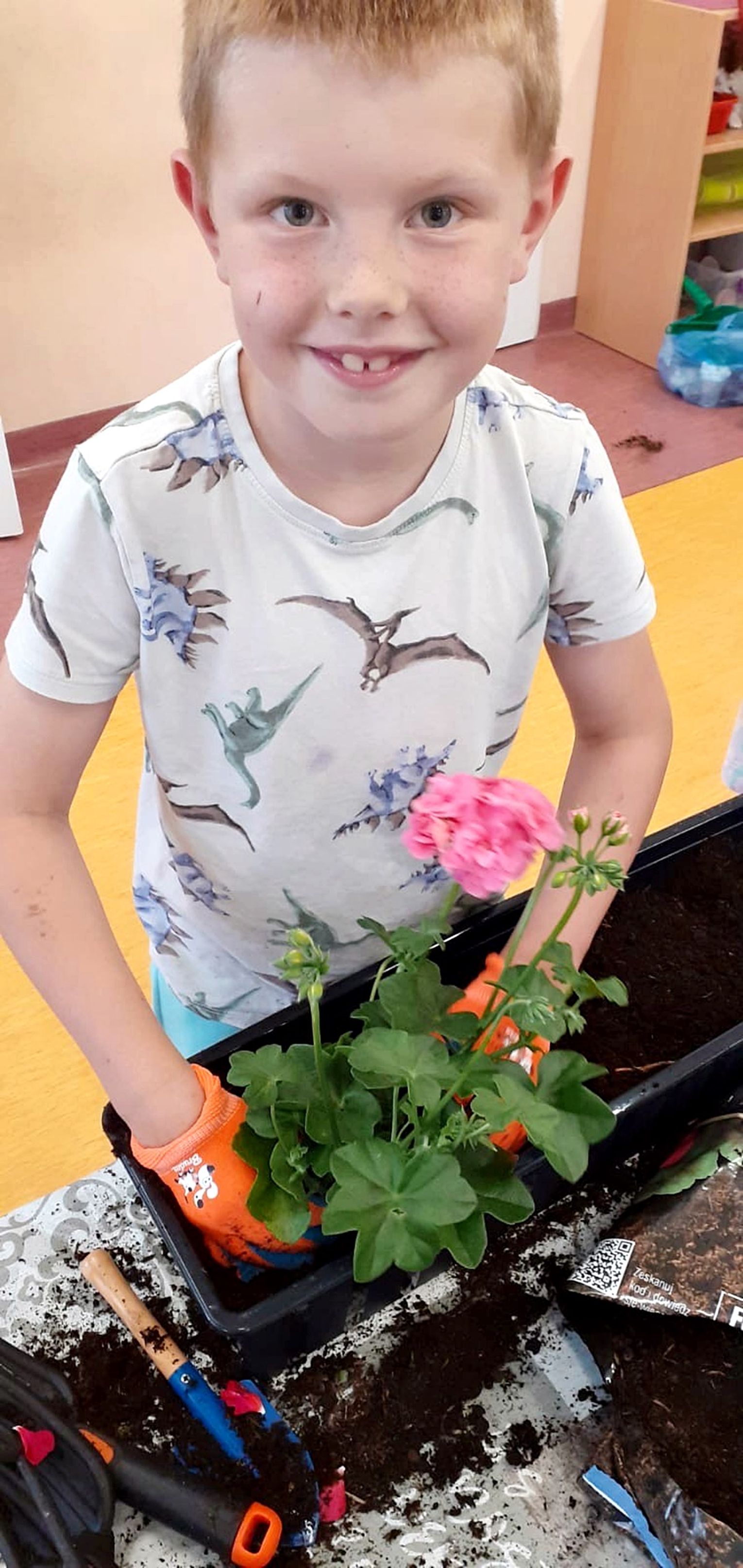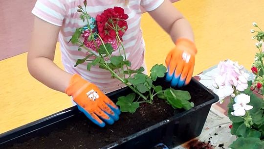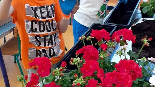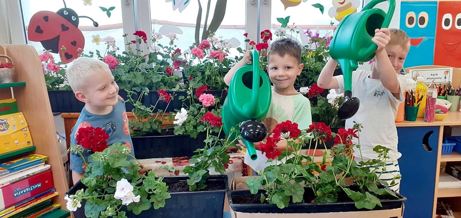 Dzieci z zaangażowaniem wybierały rośliny, przygotowywały donice i skrzynki, wsypywały ziemię, a następnie sadziły wybrane gatunki. Wśród kwiatów znalazły się m.in. pelargonie. Podczas zajęć dzieci utrwalały sobie również zasady podlewania i pielęgnacji roślin doniczkowych – wiedzą już, że rośliny potrzebują regularnej opieki, ale nie należy ich przelewać.