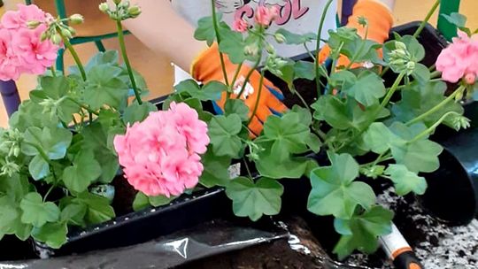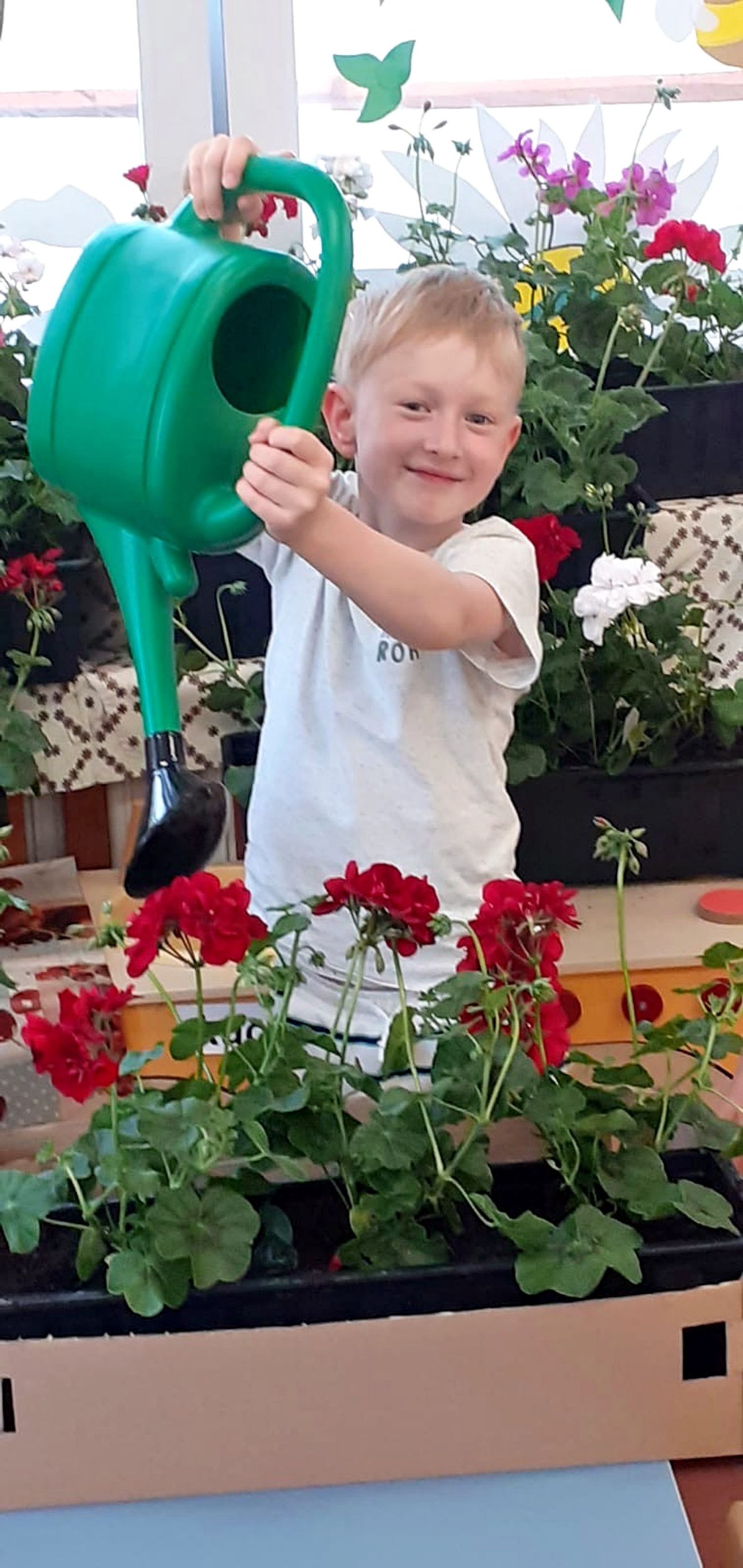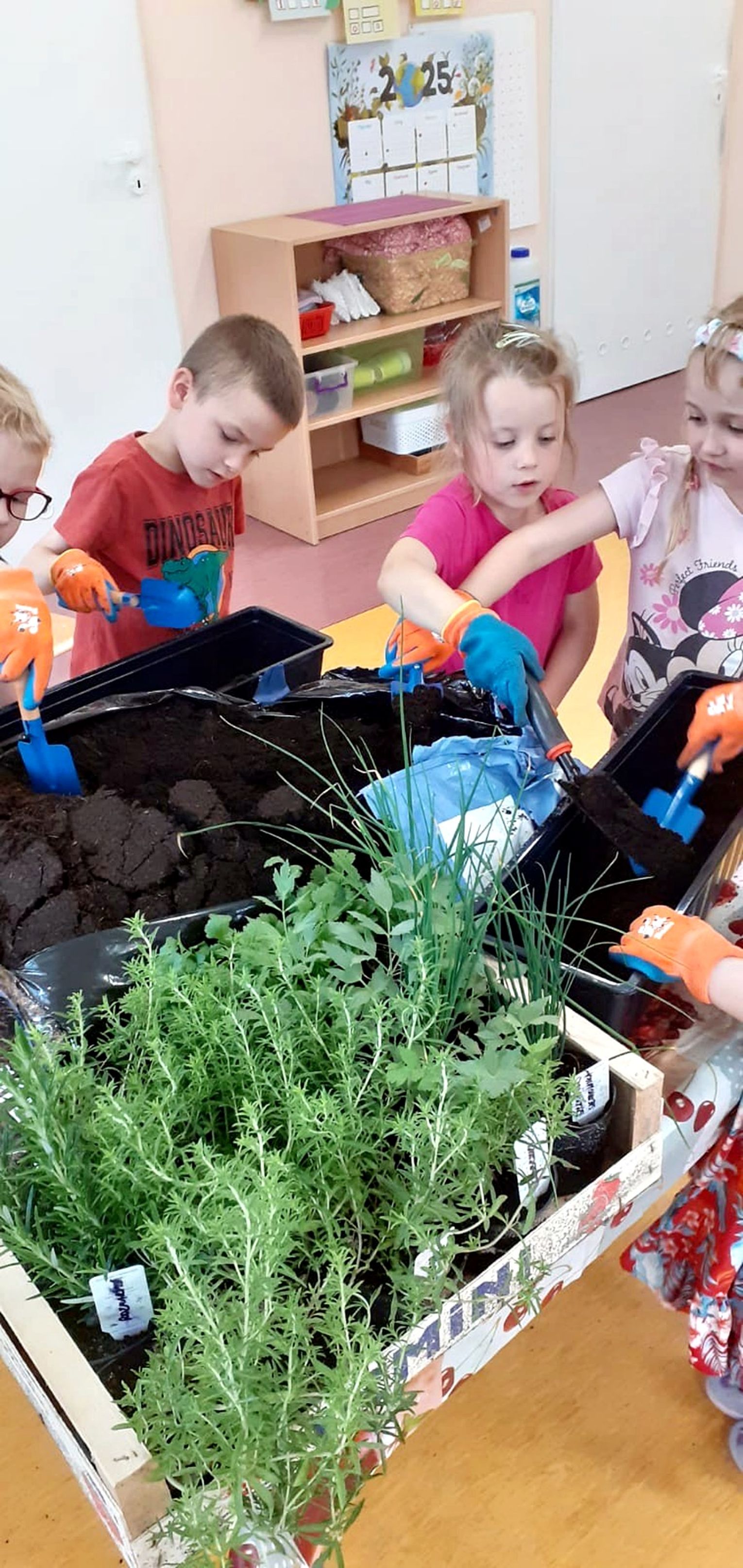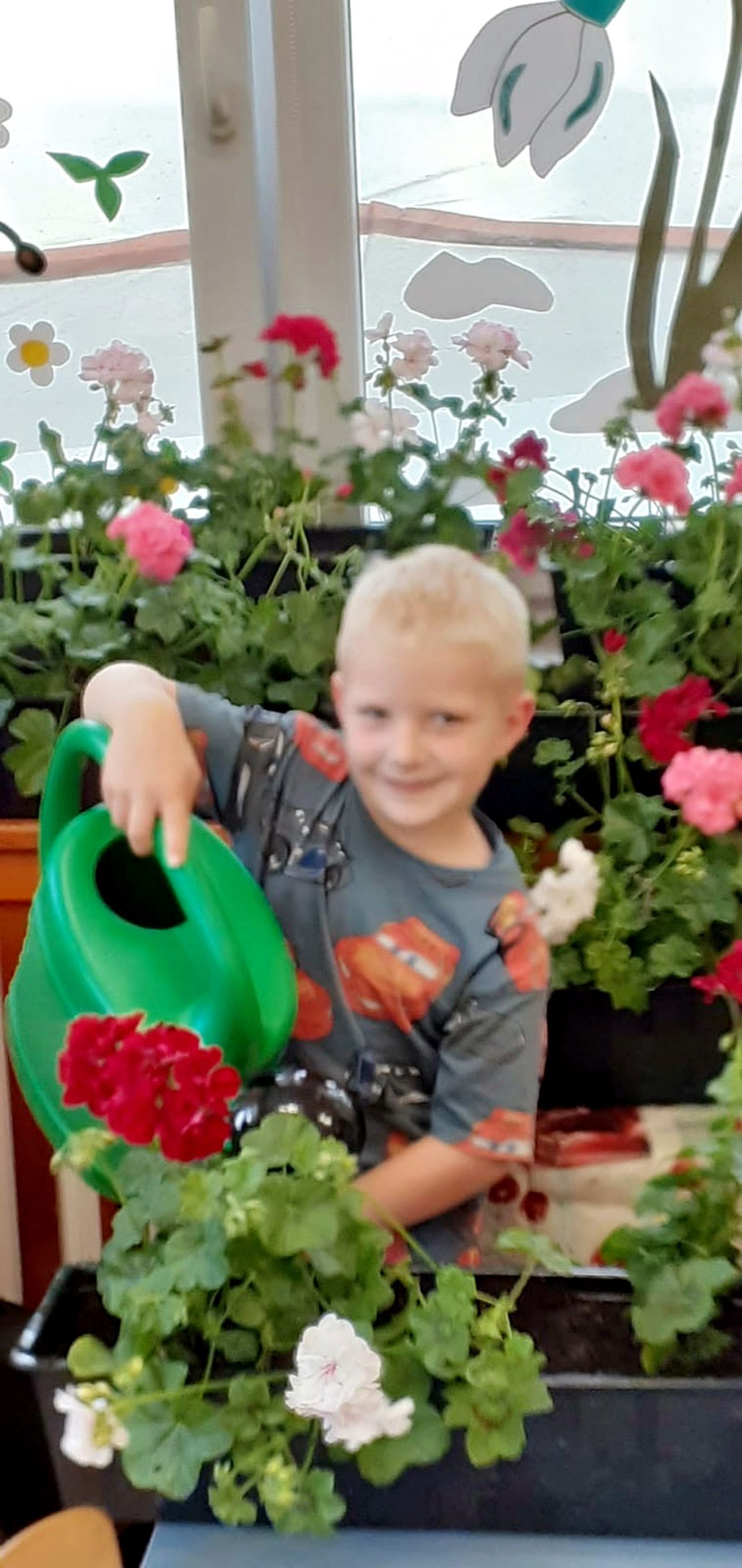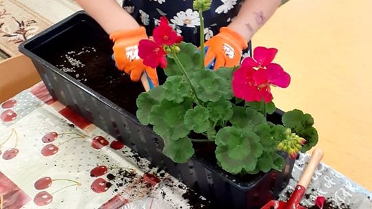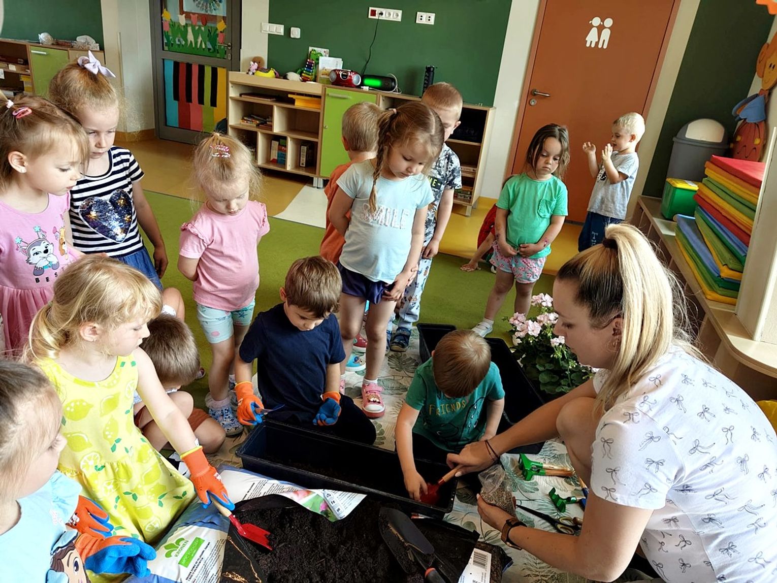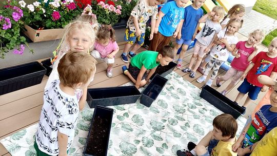 Dzieci z zaangażowaniem wybierały rośliny, przygotowywały donice i skrzynki, wsypywały ziemię, a następnie sadziły wybrane gatunki. Wśród kwiatów znalazły się m.in. pelargonie. Podczas zajęć dzieci utrwalały sobie również zasady podlewania i pielęgnacji roślin doniczkowych – wiedzą już, że rośliny potrzebują regularnej opieki, ale nie należy ich przelewać.