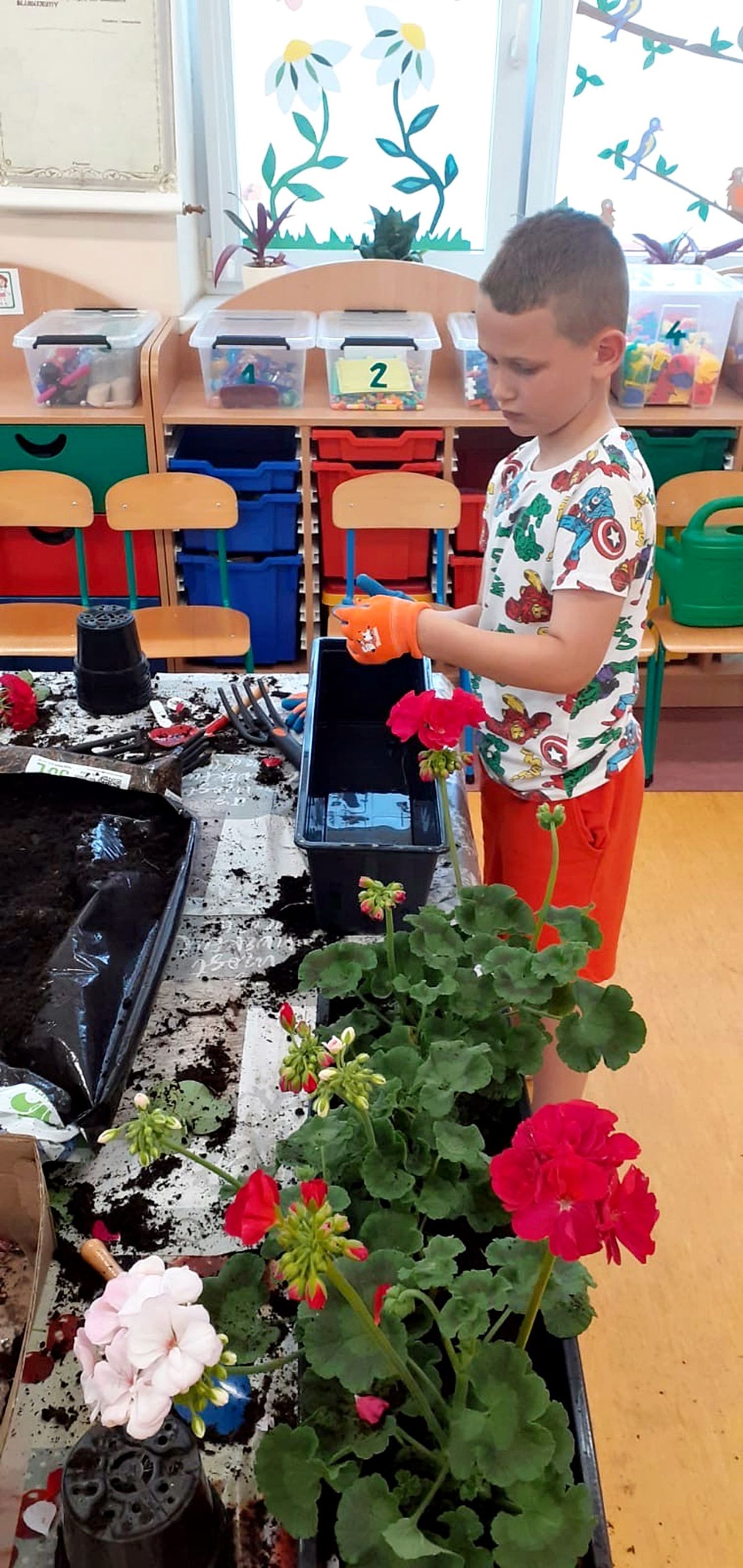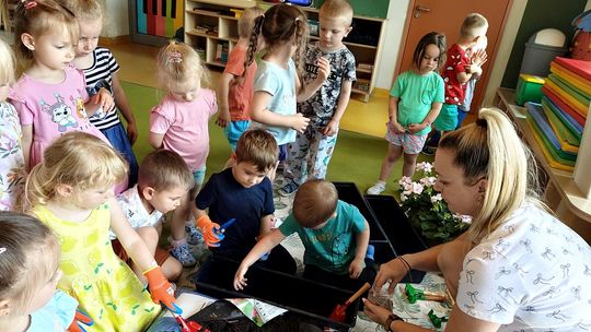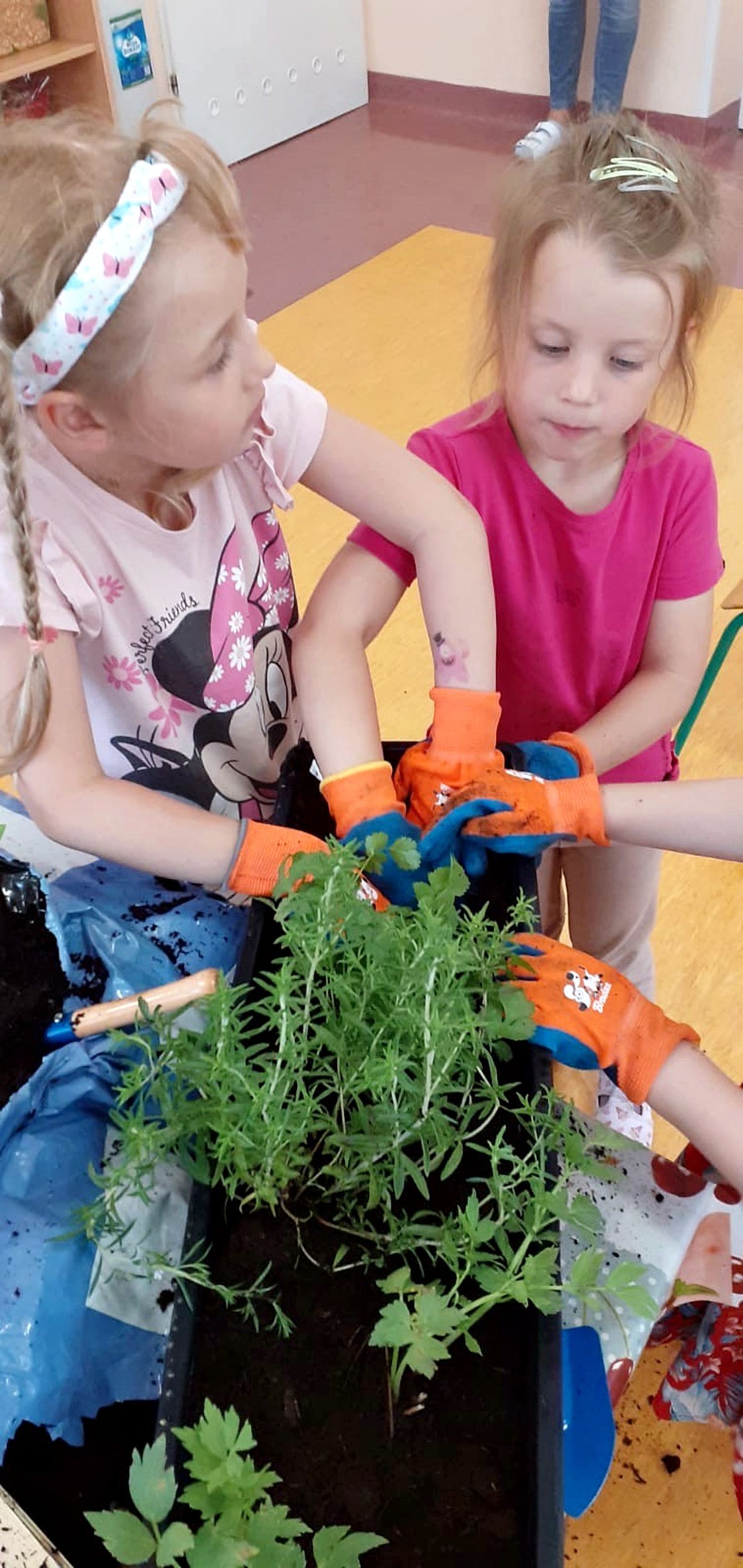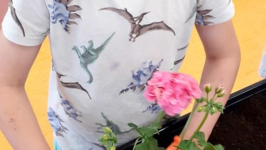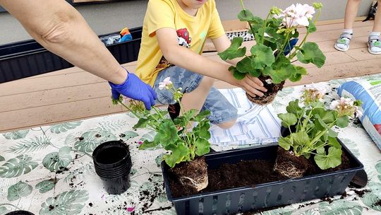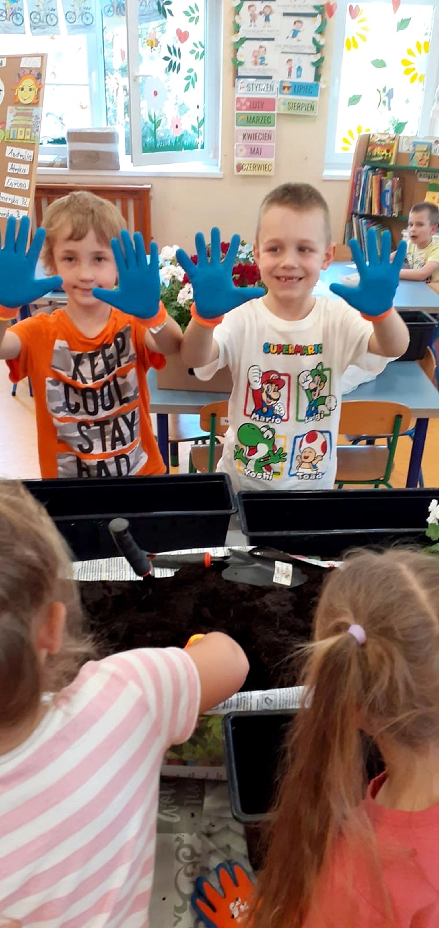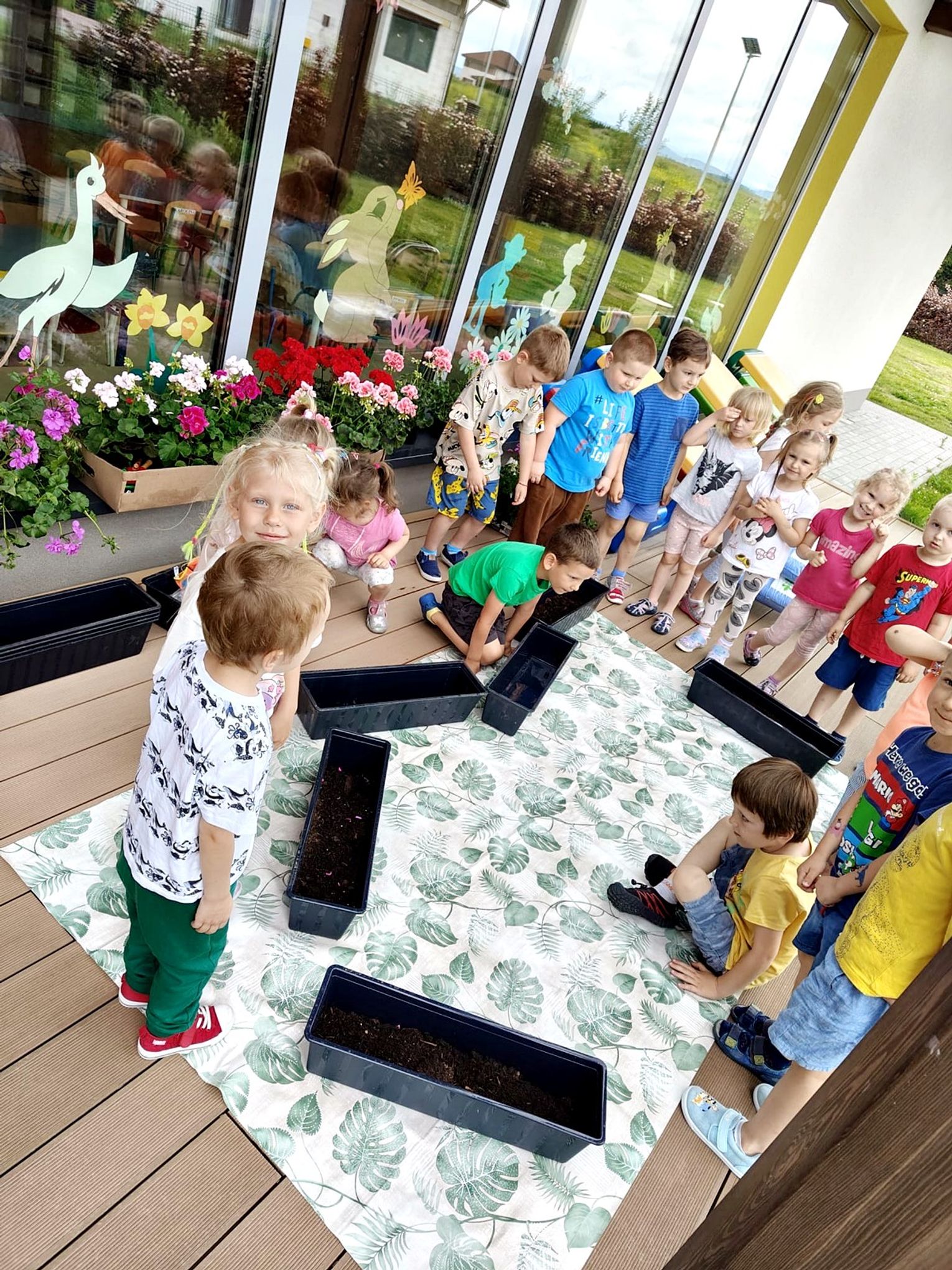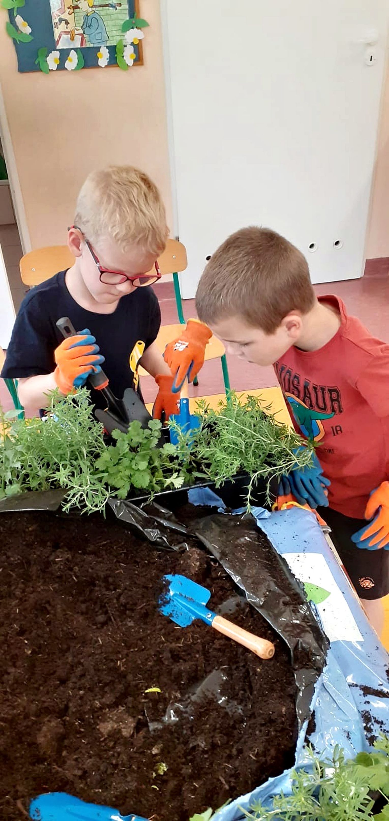 Dzieci z zaangażowaniem wybierały rośliny, przygotowywały donice i skrzynki, wsypywały ziemię, a następnie sadziły wybrane gatunki. Wśród kwiatów znalazły się m.in. pelargonie. Podczas zajęć dzieci utrwalały sobie również zasady podlewania i pielęgnacji roślin doniczkowych – wiedzą już, że rośliny potrzebują regularnej opieki, ale nie należy ich przelewać.