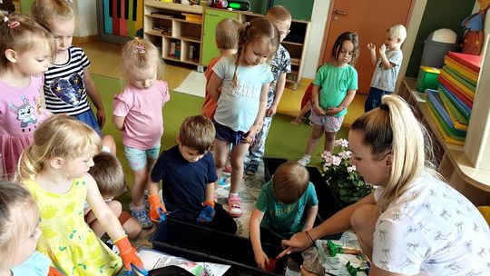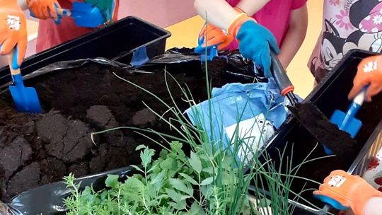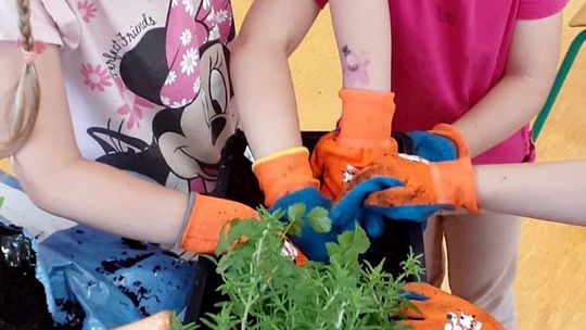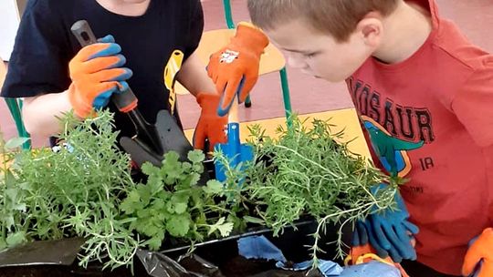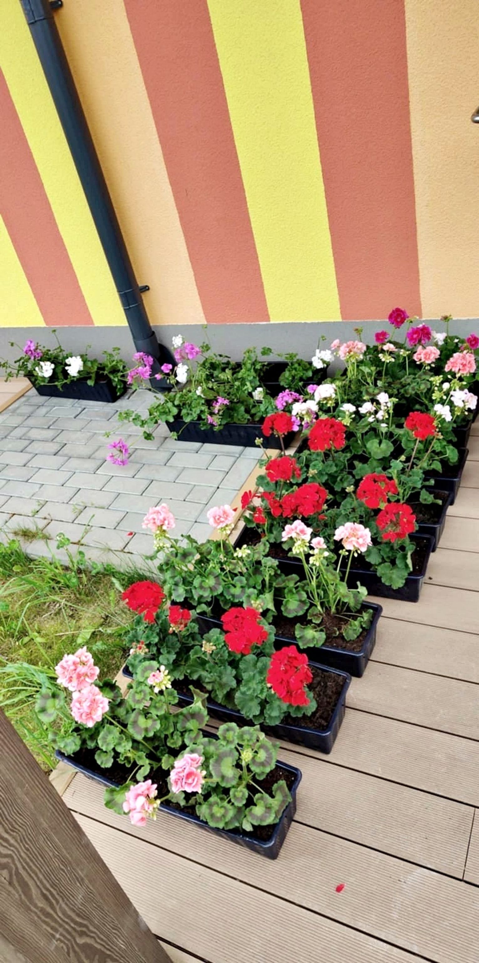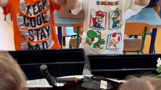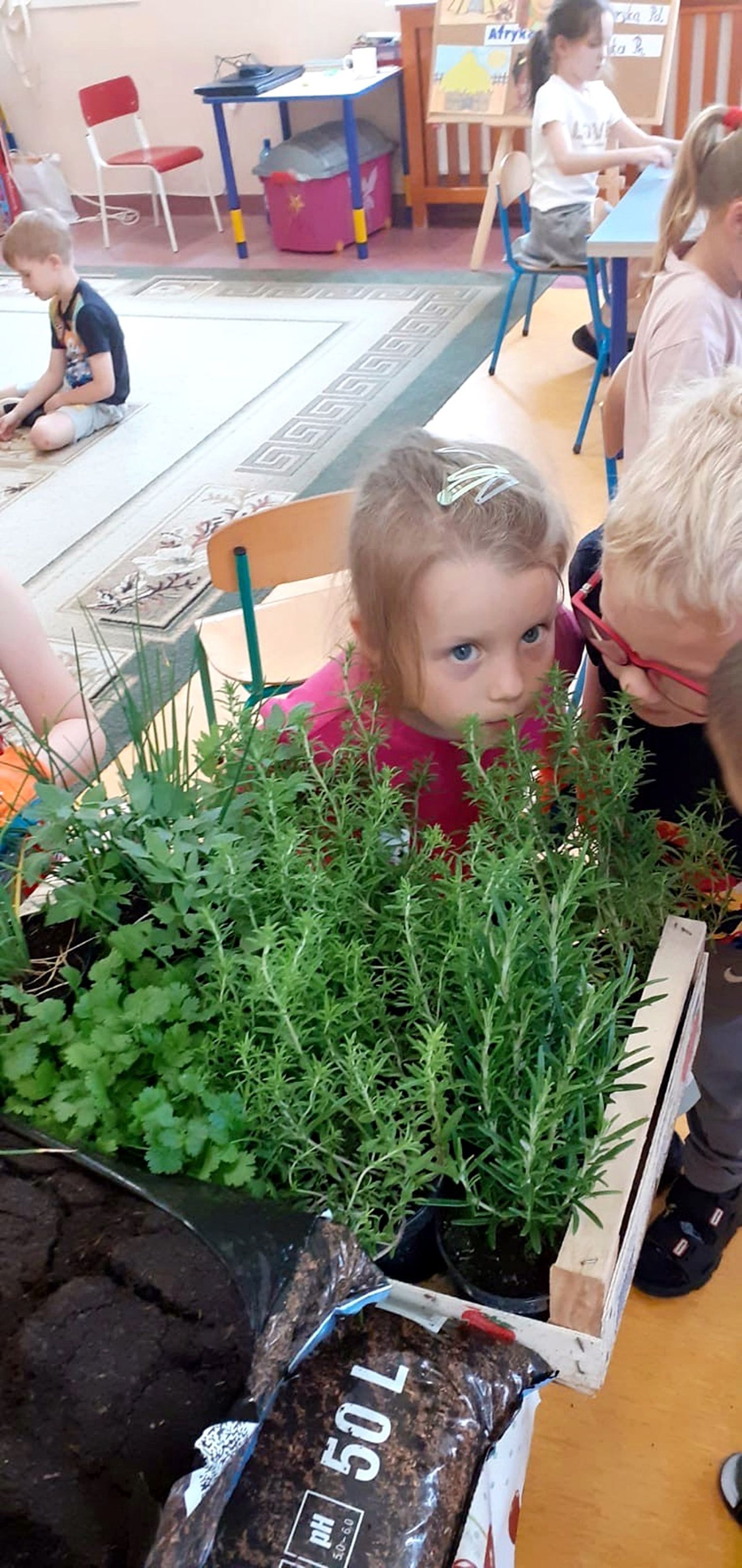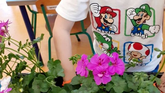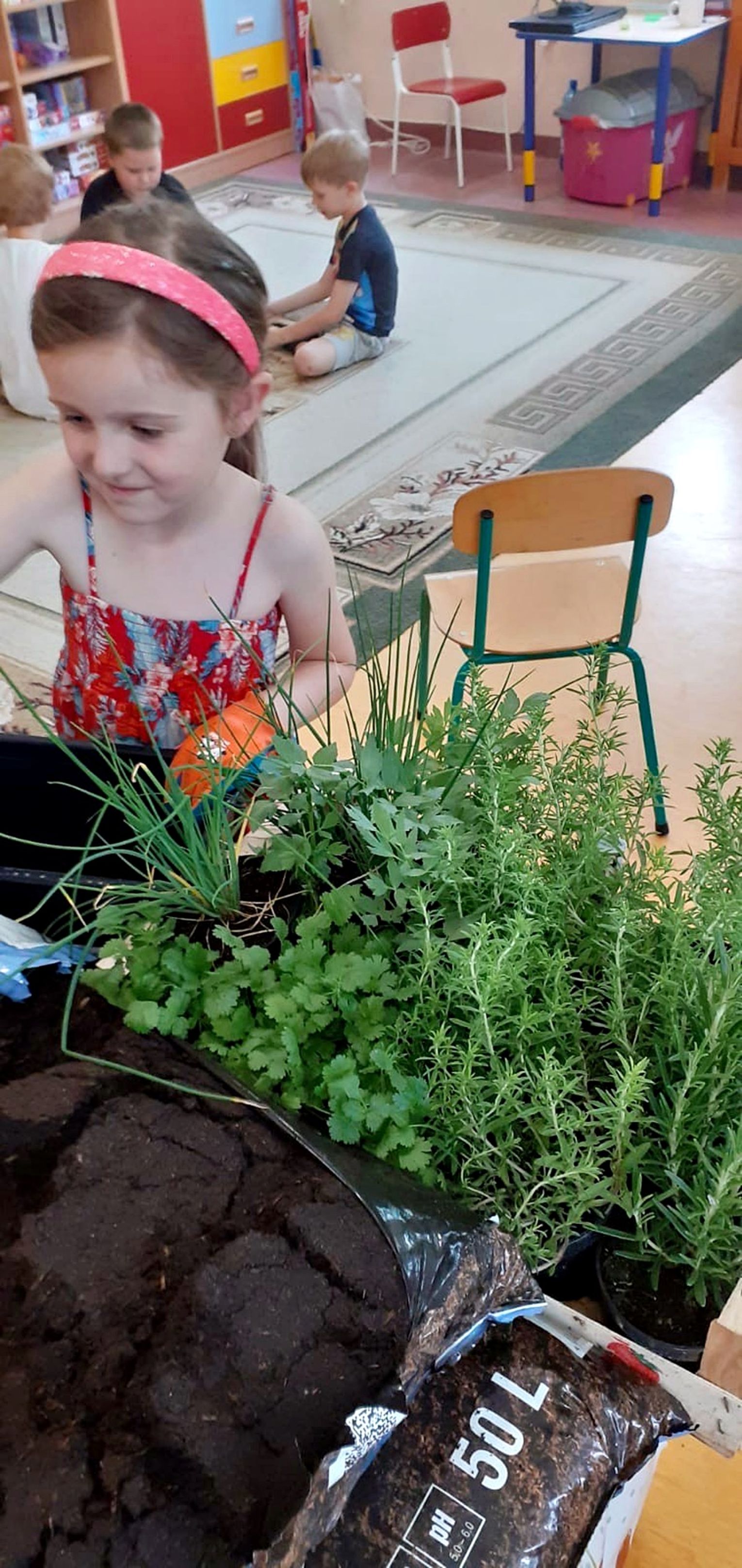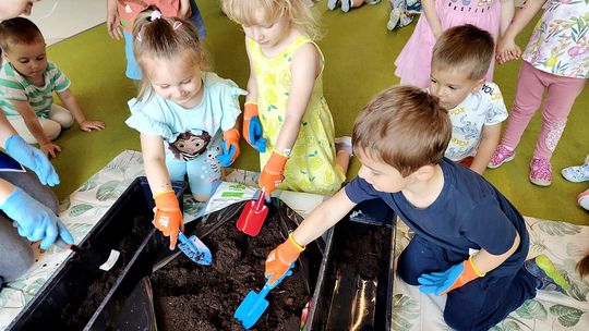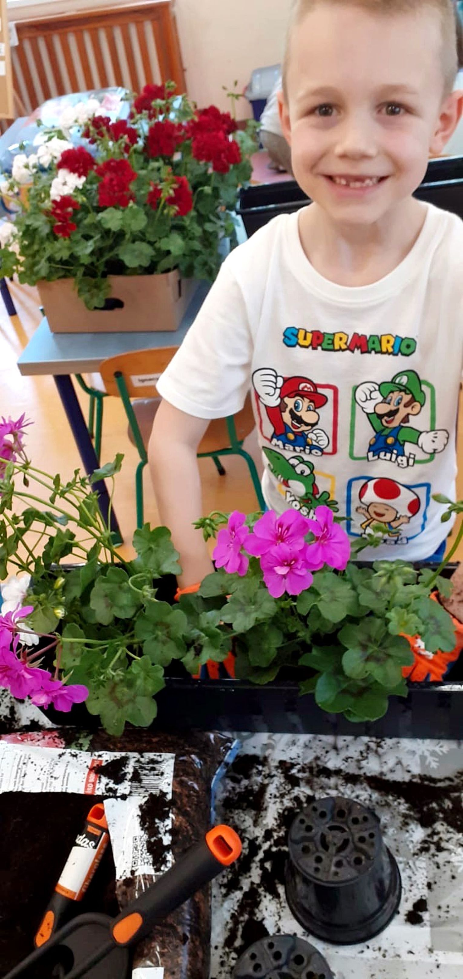 Dzieci z zaangażowaniem wybierały rośliny, przygotowywały donice i skrzynki, wsypywały ziemię, a następnie sadziły wybrane gatunki. Wśród kwiatów znalazły się m.in. pelargonie. Podczas zajęć dzieci utrwalały sobie również zasady podlewania i pielęgnacji roślin doniczkowych – wiedzą już, że rośliny potrzebują regularnej opieki, ale nie należy ich przelewać.