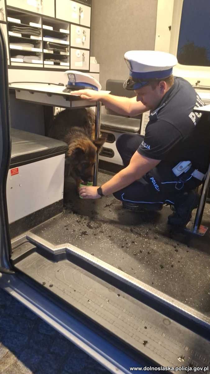 Podczas statycznej kontroli prędkości w Świdnicy do radiowozu wszedł samowolnie owczarek niemiecki, który – jak się okazało – był bardzo spragniony i najwyraźniej szukał pomocy. Przez blisko godzinę pies przebywał z funkcjonariuszami, którzy nie tylko zapewnili mu wodę, ale też podjęli próbę odnalezienia jego właścicieli. Policjanci wypytywali mieszkańców okolicznych posesji, jednak nikt niestety nie rozpoznał czworonoga ani nie potrafił wskazać, do kogo może należeć.