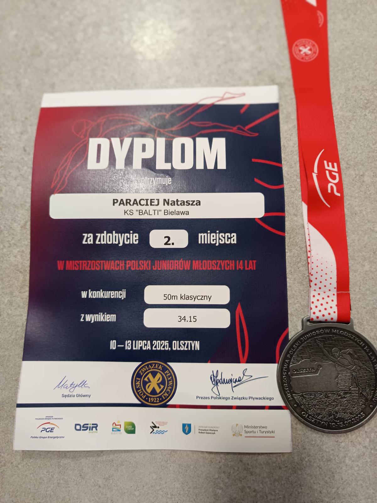 - 50m stylem klasycznym, srebrny medal i rekord życiowy 34.15 s