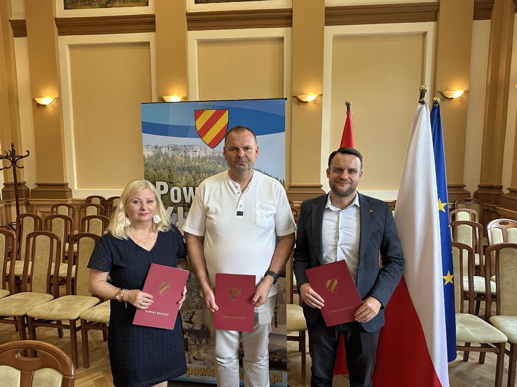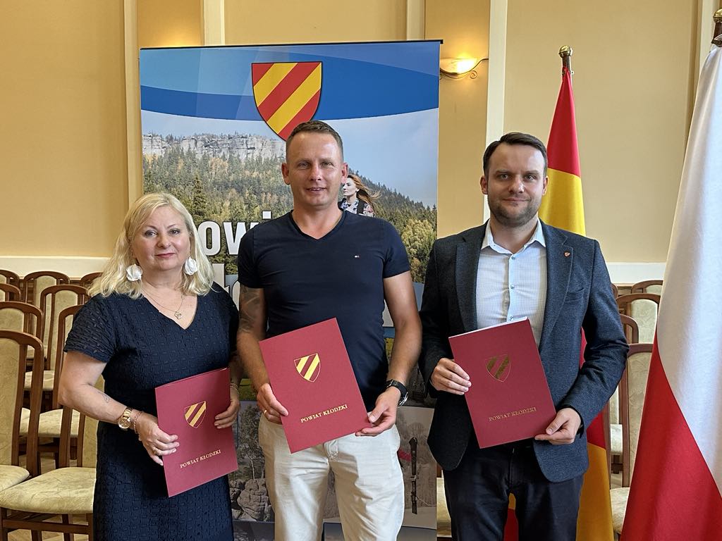 W poniedziałek, 21 lipca 2025 roku, w siedzibie Starostwa Powiatowego w Kłodzku podpisano umowy z wykonawcami zadań w ramach inwestycji pod nazwą: