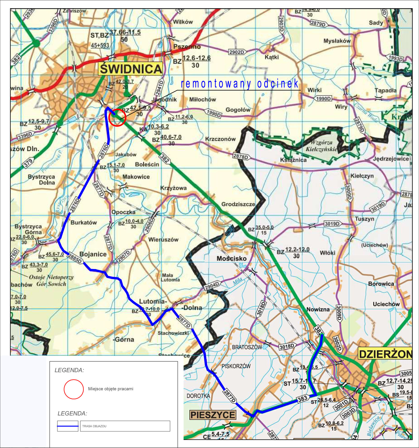 Zgodnie z zatwierdzoną przez Marszałka Województwa Dolnośląskiego organizacją ruchu, objazd dla samochodów ciężarowych, ze względu na ograniczenia tonażowe oraz infrastrukturę mostową, został wyznaczony drogami wojewódzkimi i powiatowymi, przez miejscowości Pieszyce i Dzierżoniów.