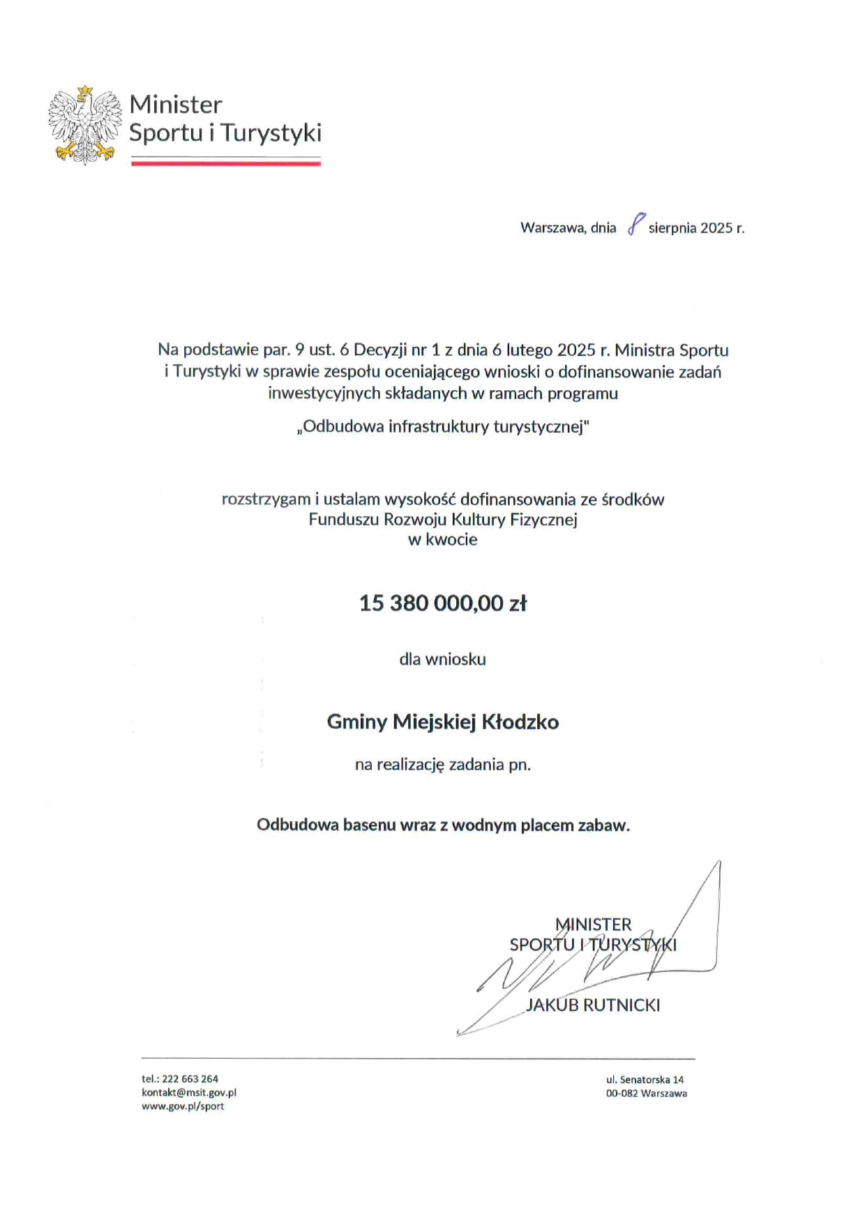 W piątkowe popołudnie Kłodzko stało się sportowym centrum regionu. Miasto odwiedzili Wicemarszałek Sejmu Monika Wielichowska, Minister Sportu i Turystyki Jakub Rutnicki oraz Sekretarz Stanu Piotr Borys. Powód? Ogromna dotacja – dokładnie 15 380 000 zł – na odbudowę nieczynnego od lat odkrytego basenu oraz stworzenie nowoczesnego wodnego placu zabaw.