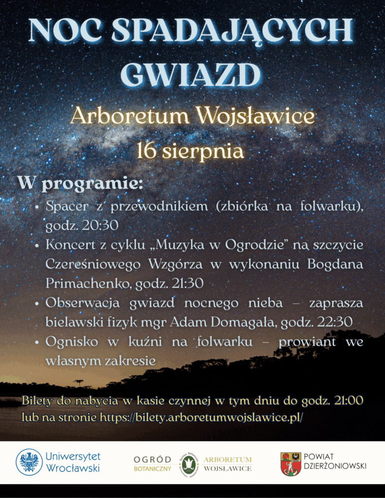 Do wspólnej obserwacji gwiazd o godzinie 22:30 zaprasza bielawski fizyk mgr Adam Domagała, który z wielką pasją i zamiłowaniem opowie o sekretach skrywanych ponad chmurami. Odpowie on na wszelkie pytania dotyczące kosmosu oraz podzieli się swoją wiedzą w zakresie astronomii. Z jego pomocą wprowadzeni zostaniemy w pozaziemską atmosferę i odkryjemy nieuchwytne na co dzień ciała niebieskie. Następnie w panującym dookoła mroku rozpocznie się podniebny seans, który obserwować będziemy z malowniczego krajobrazu Arboretum. Perseidy rozświetlą nocne niebo, a ich blask na długo pozostanie w naszej pamięci. Podziwiający spektakl goście będą mieli okazję poczuć, co oznacza sięgnąć gwiazd.