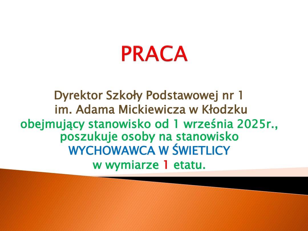 SP nr 1 poszukuje pracowników na stanowisko wychowawca świetlicy (cały etet) i bibliotekarz (1/2 etatu).