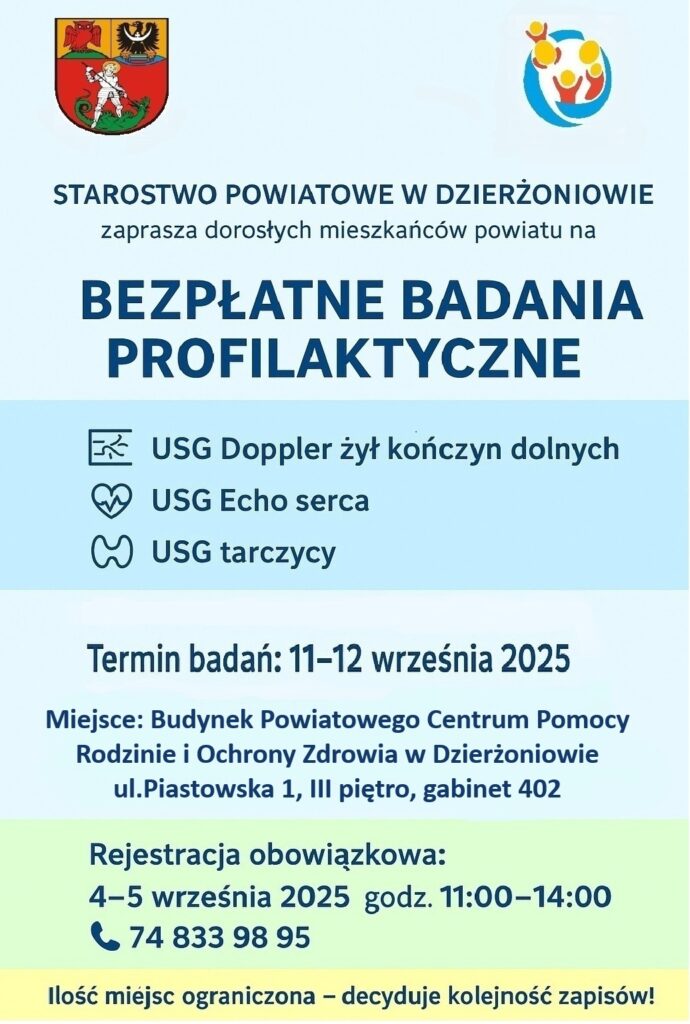 Badania odbędą się w dniu 11 i 12 września w Budynku Powiatowego Centrum Pomocy Rodzinie i Ochrony Zdrowia w Dzierżoniowie, ul. Piastowska 1, III piętro, gabinet 402.