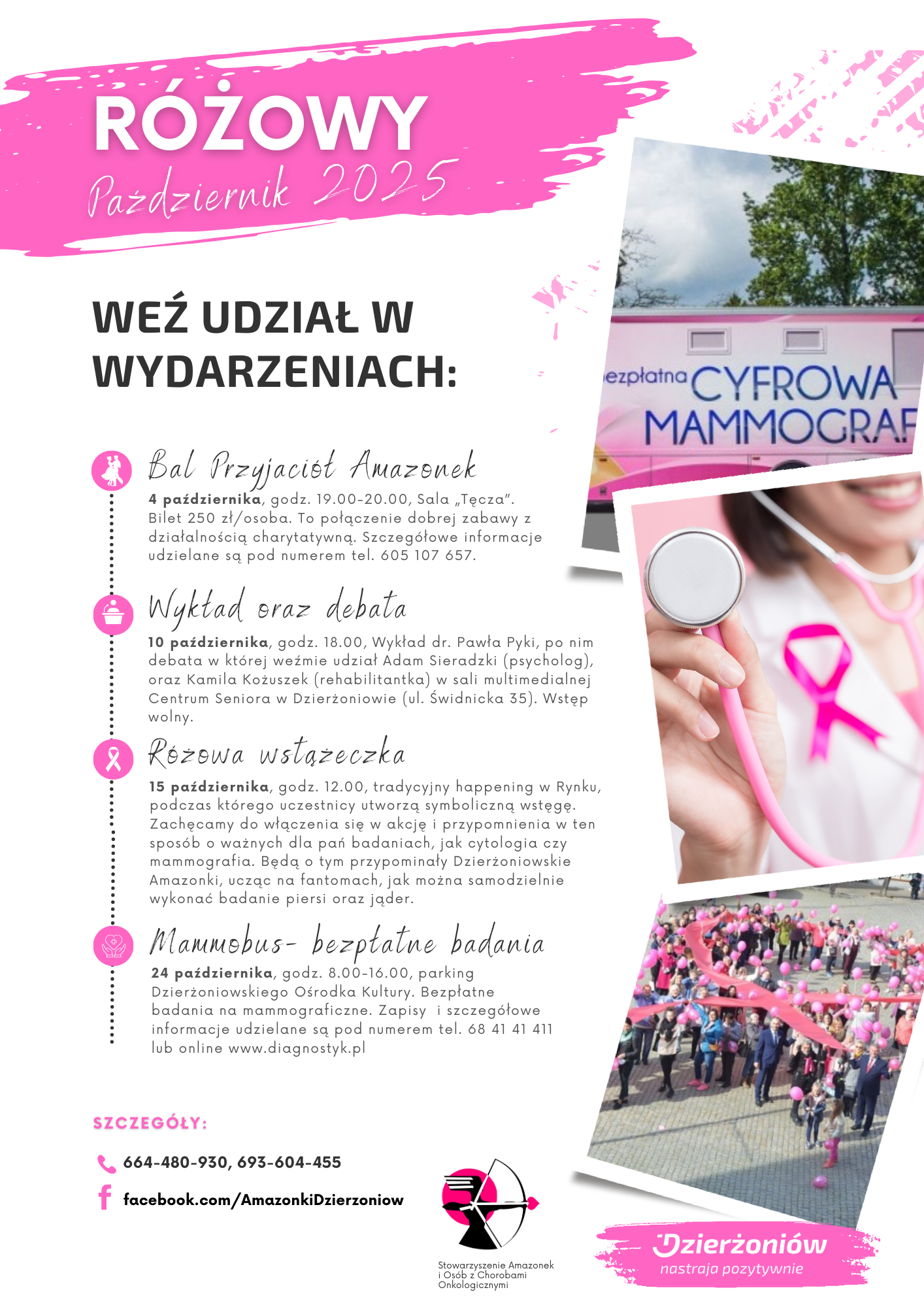 Październik to wyjątkowy miesiąc – na całym świecie symbolizuje walkę z nowotworami piersi i przypomina o kluczowej roli profilaktyki. W tym roku, podobnie jak w latach ubiegłych, Dzierżoniów włącza się w tę szlachetną inicjatywę. Stowarzyszenie Amazonki Dzierżoniów oraz lokalni partnerzy przygotowali dla Was bogaty program wydarzeń, które łączą edukację, wsparcie i solidarność. Nie zabraknie też okazji do dobrej zabawy!