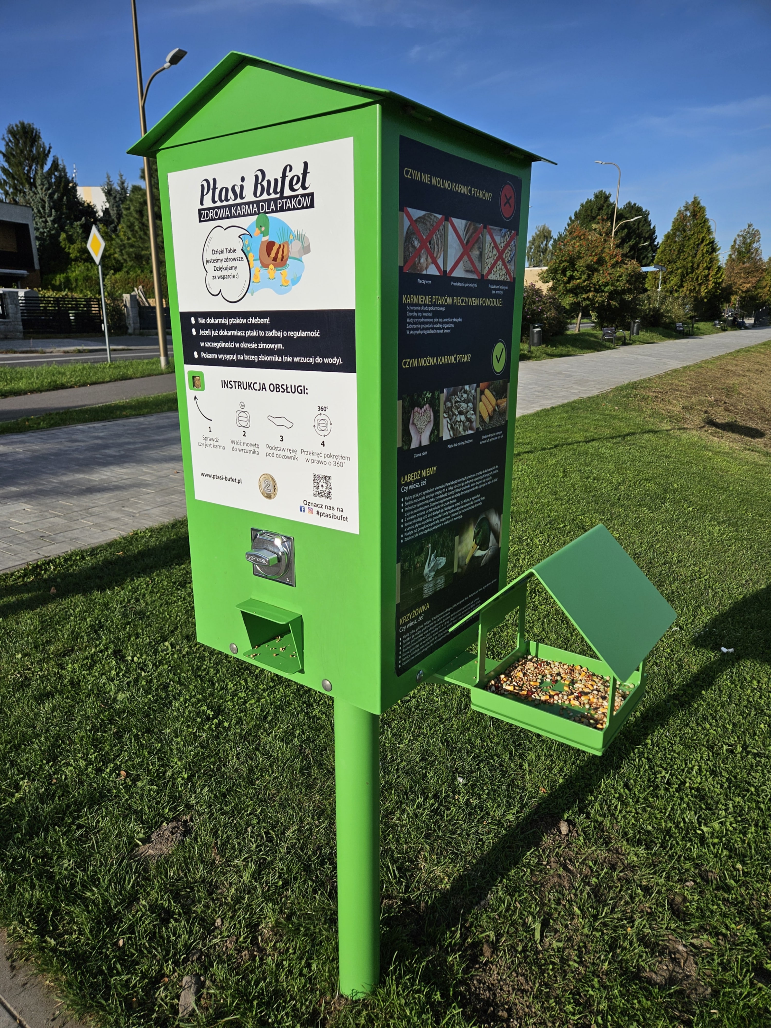 Ptasi Bufet to proste, innowacyjne rozwiązanie dla osób, które chcą wspierać miejską faunę. Zamiast tradycyjnego dokarmiania chlebem czy resztkami jedzenia, co może szkodzić ptakom, automaty oferują pełnowartościową karmę dostosowaną do potrzeb ptaków żyjących w mieście. Na urządzeniach znajduje się instrukcja obsługi – wystarczy 2 zł, aby otrzymać porcję odżywczych ziaren dla ptaków. Ważne, aby karmy nie wsypywać bezpośrednio do wody, lecz pozostawić ją na brzegu.