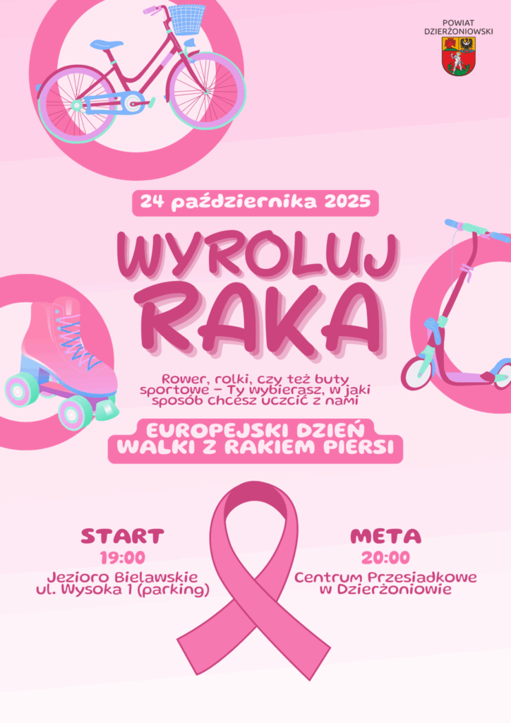 W tym okresie organizowane są liczne kampanie edukacyjne, które przypominają o znaczeniu profilaktyki, wczesnej diagnostyki oraz nowoczesnych metod leczenia. Symbolem tej inicjatywy jest różowa wstążka, a 15 października obchodzimy Europejski Dzień Walki z Rakiem Piersi. Powiat Dzierżoniowski już po raz kolejny aktywnie włącza się w obchody tego ważnego miesiąca. W ramach działań promujących zdrowie i solidarność z osobami dotkniętymi chorobą nowotworową, starosta dzierżoniowski Grzegorz Kosowski zaprasza do udziału w wyjątkowym wydarzeniu „Wyroluj Raka”, które odbędzie się 24 października. To aktywna forma wsparcia i okazja do pokazania, że razem mamy siłę.