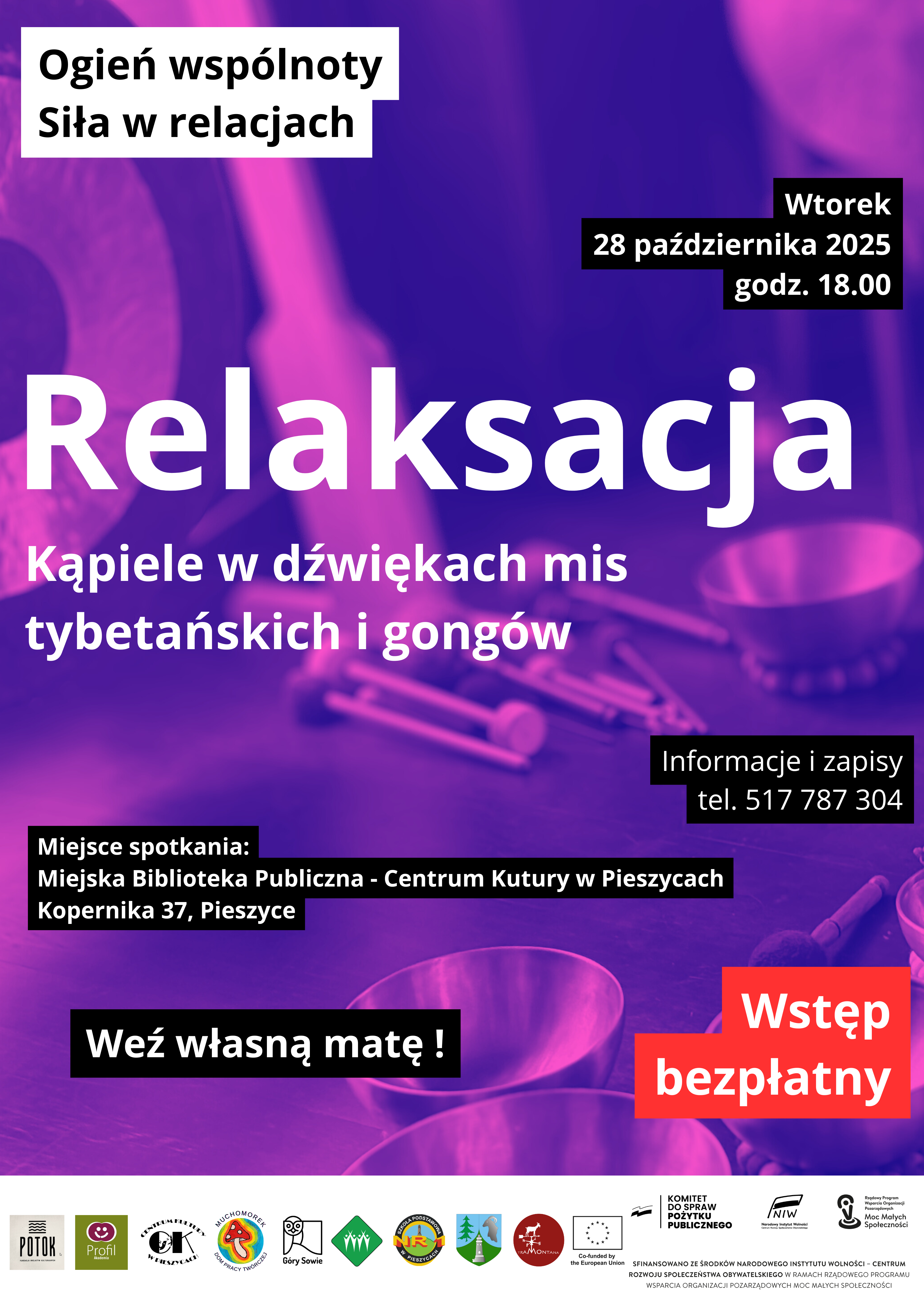 Relaksacja – kąpiel w dźwiękach mis i gongów, Miejska Biblioteka Publiczna – Centrum Kultury w Pieszycach