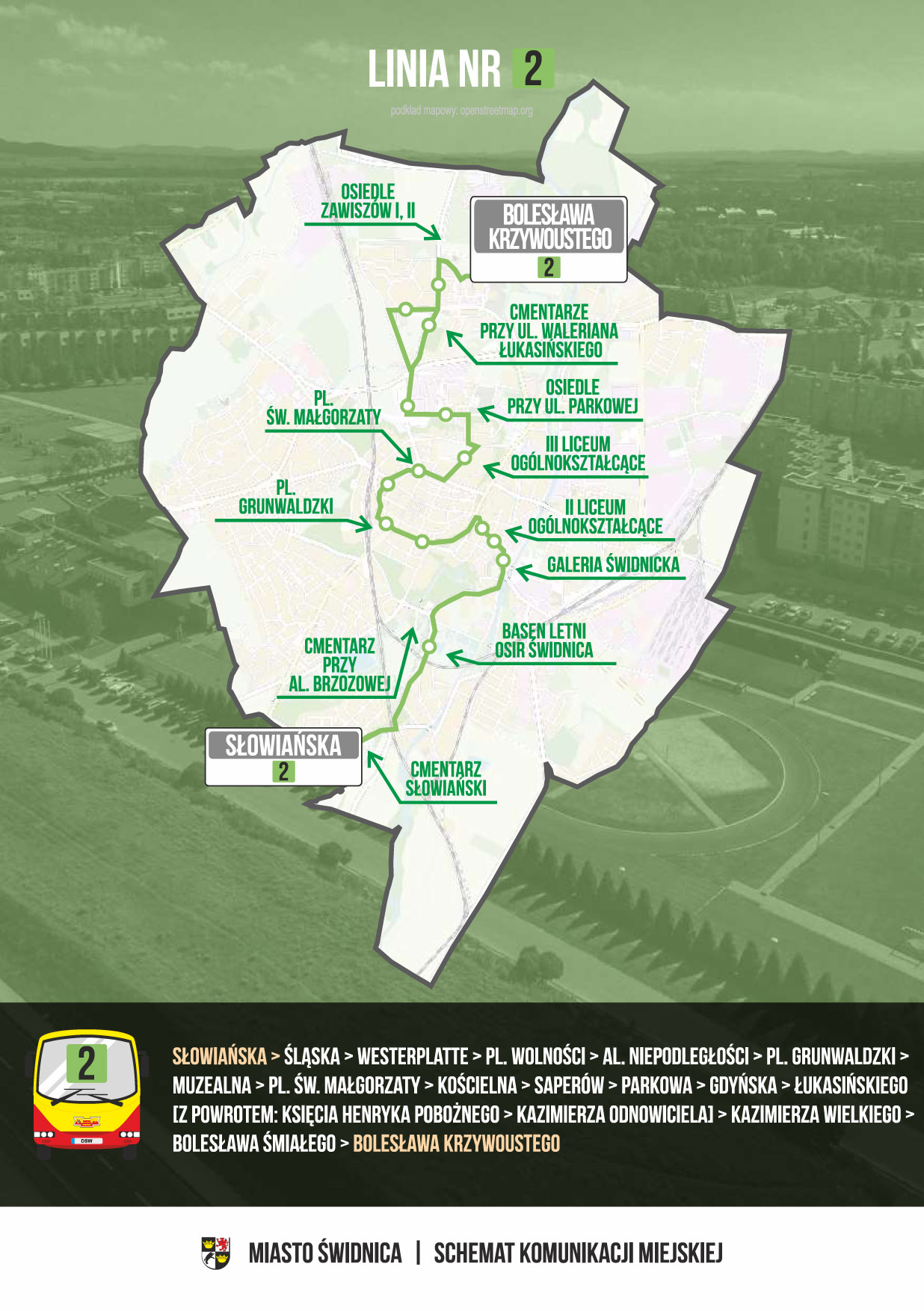 Największe korekty dotyczą linii nr 2, która przestanie obsługiwać przystanki przy ul. Pionierów Ziemi Świdnickiej oraz al. Niepodległości (w kierunku pl. Grunwaldzkiego). W zamian autobusy będą zatrzymywać się przy pl. Michała Drzymały i pl. Wolności, a trasa zakończy się na ul. Słowiańskiej. Zmiana ma umożliwić lepszy dojazd mieszkańcom osiedla Zawiszów do II Liceum Ogólnokształcącego oraz osobom z rejonu ul. Parkowej do Galerii Świdnickiej.