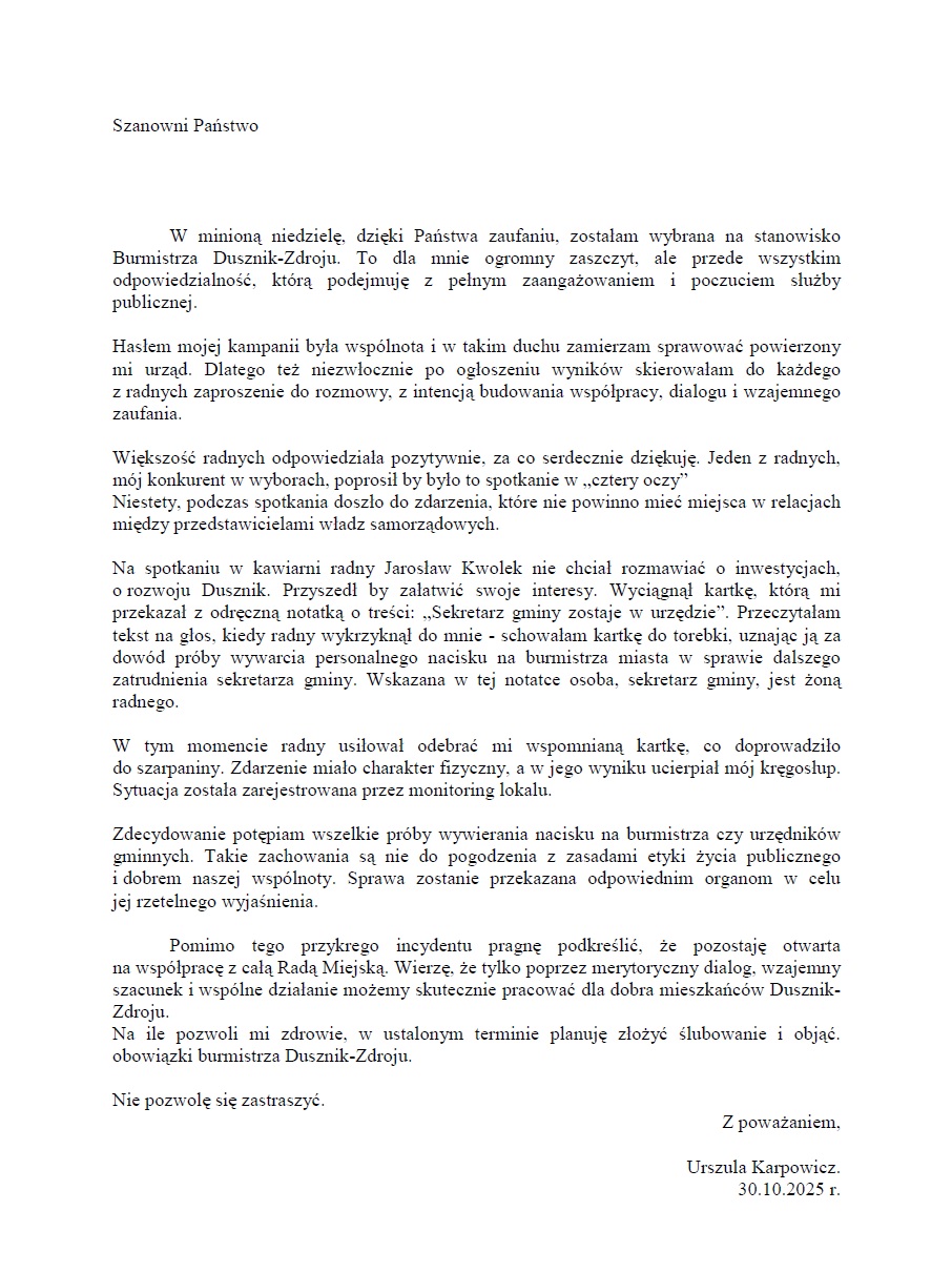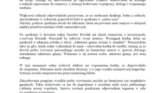 Zupełnie inaczej sprawę przedstawia Urszula Karpowicz. Jak napisała w swoim oficjalnym oświadczeniu (pełna treść poniżej), radny przyszedł "załatwić swoje interesy", przekazał jej odręczną notatkę dotyczącą przyszłości sekretarza gminy, po czym próbował wymusić jej zwrot, doprowadzając do szarpaniny. Nowa burmistrz stanowczo potępiła takie metody nacisku, zapowiadając oficjalne skierowanie sprawy do odpowiednich organów.