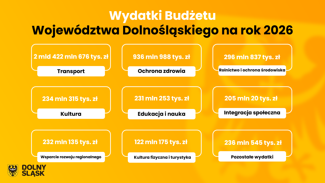 Najwięcej pieniędzy trafi na transport, ochronę zdrowia, rolnictwo i ochronę środowiska, a także kulturę, edukację i integrację społeczną. - Przed nami budżet rekordowy. Warto podkreślić, że jesteśmy pod względem wydatków drugim regionem w Polsce – to świadczy o tym, że jesteśmy regionem mocno inwestycyjnym. Zamierzamy kontynuować wiele zadań, które rozpoczęliśmy wcześniej, ale przed nami również szereg nowych inicjatyw, które chcemy realizować z myślą o Dolnoślązakach. Duże podziękowania dla klubów koalicyjnych, które nad tym budżetem z sukcesem pracowały – mówi Paweł Gancarz, Marszałek Województwa Dolnośląskiego.