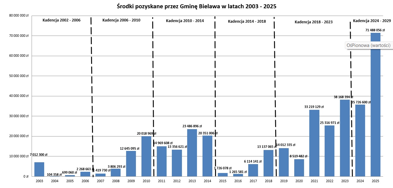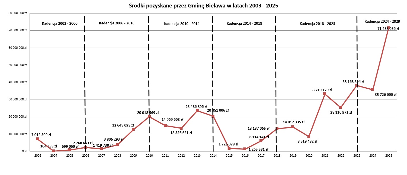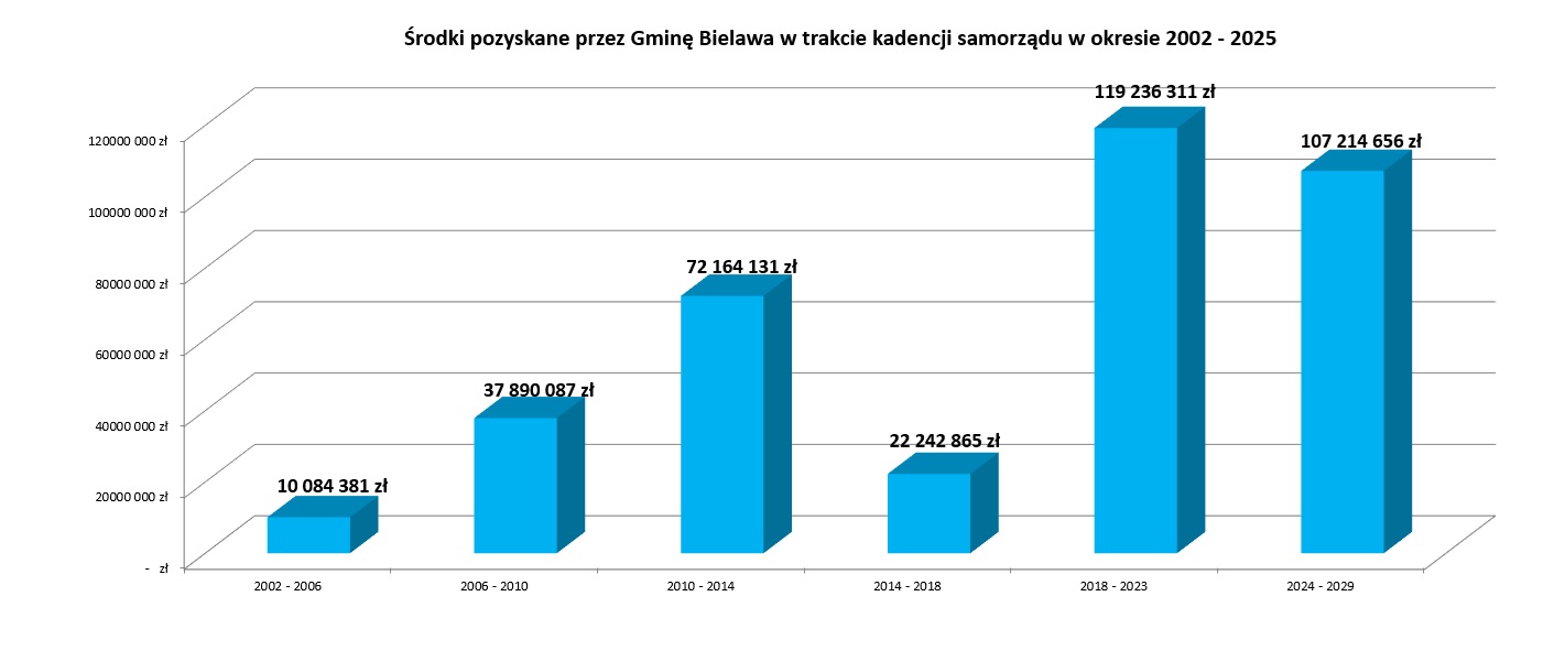Uzyskany rezultat pozwolił także przekroczyć magiczną barierę 100.000.000 zł pozyskanych w ciągu jednej kadencji. Mimo że obecny okres władzy samorządowej rozpoczął się niespełna 2 lata temu, skumulowana wartość zdobytych w tym czasie dotacji, na koniec 2025 r. wyniósł aż 107.214.656 zł.