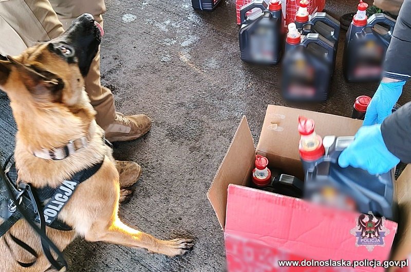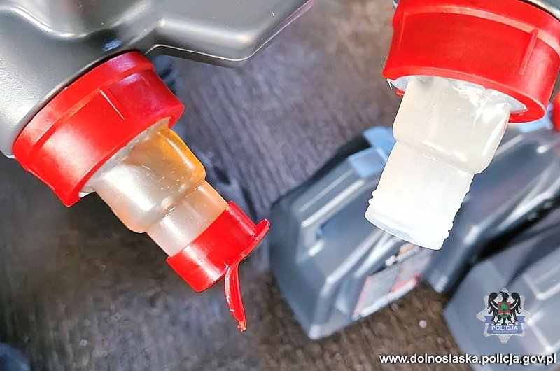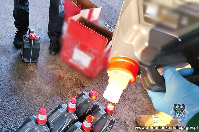 Przy wykorzystaniu psa służbowego ze stanu głogowskiej komendy wałbrzyscy policjanci przystąpili do przeszukania pojazdu. W bagażniku znajdowały się kanistry. Wśród tych oryginalnych z olejem silnikowym, były jednak te, w których znajdował się jasny płyn, który nie przypominał oryginalnego oleju. Mundurowi zabezpieczyli łącznie 30 litrów płynnej amfetaminy, z której można było wykonać aż 120 kilogramów gotowego produktu do dalszej dystrybucji na czarnym rynku.