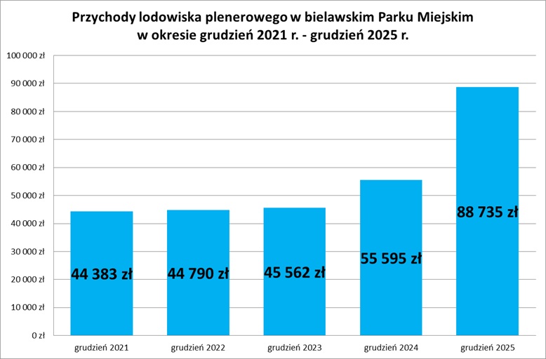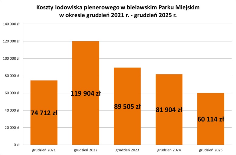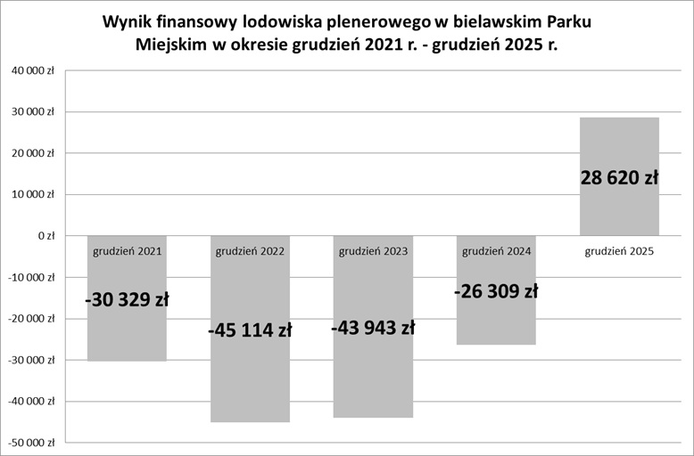 Łączne wydatki wyniosły zatem 60.114,08 zł. Oznacza to, że wynik finansowy z działalności lodowiska w grudniu 2025 r. był dodatni i osiągnął poziom 28.620,42 zł. Jest to najlepszy bilans od początku działalności tej parkowej atrakcji.