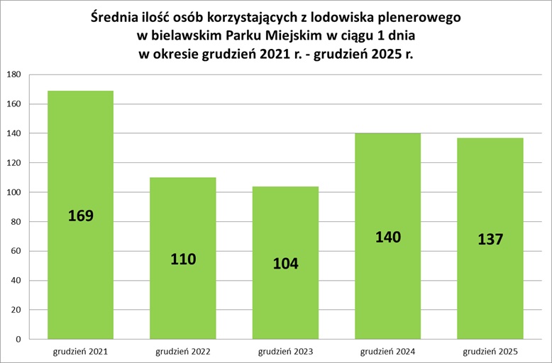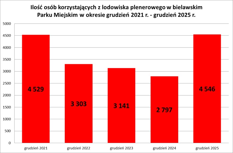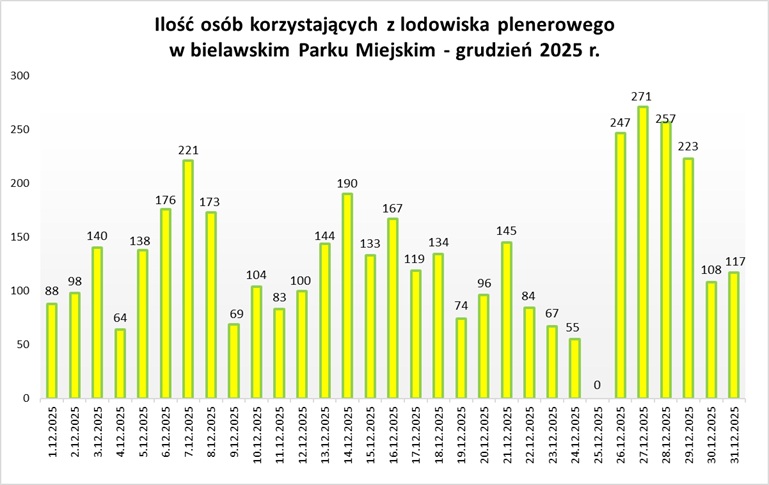 Mimo tak dużej konkurencji podażowej w ciągu 3 dni listopada i 30 dni grudnia ubiegłego roku, uwzględniając uwarunkowania pogodowe oraz Święta Bożego Narodzenia i Sylwestra, udało się zorganizować w sumie 319 godzinnych sesji (w 2024 r. - 200), z których skorzystało 4.546 osób (w 2023 r. - 2.797 osób). Taki wynik oznacza statystycznie, że podczas jednej sesji na lód wyjeżdżało średnio 14 osób (w 2024 r. - 14 osób). Z kolei w ciągu jednego dnia z lodowej tafli korzystało w tym czasie średnio 137 łyżwiarzy (w 2024 r. - 140 osoby).