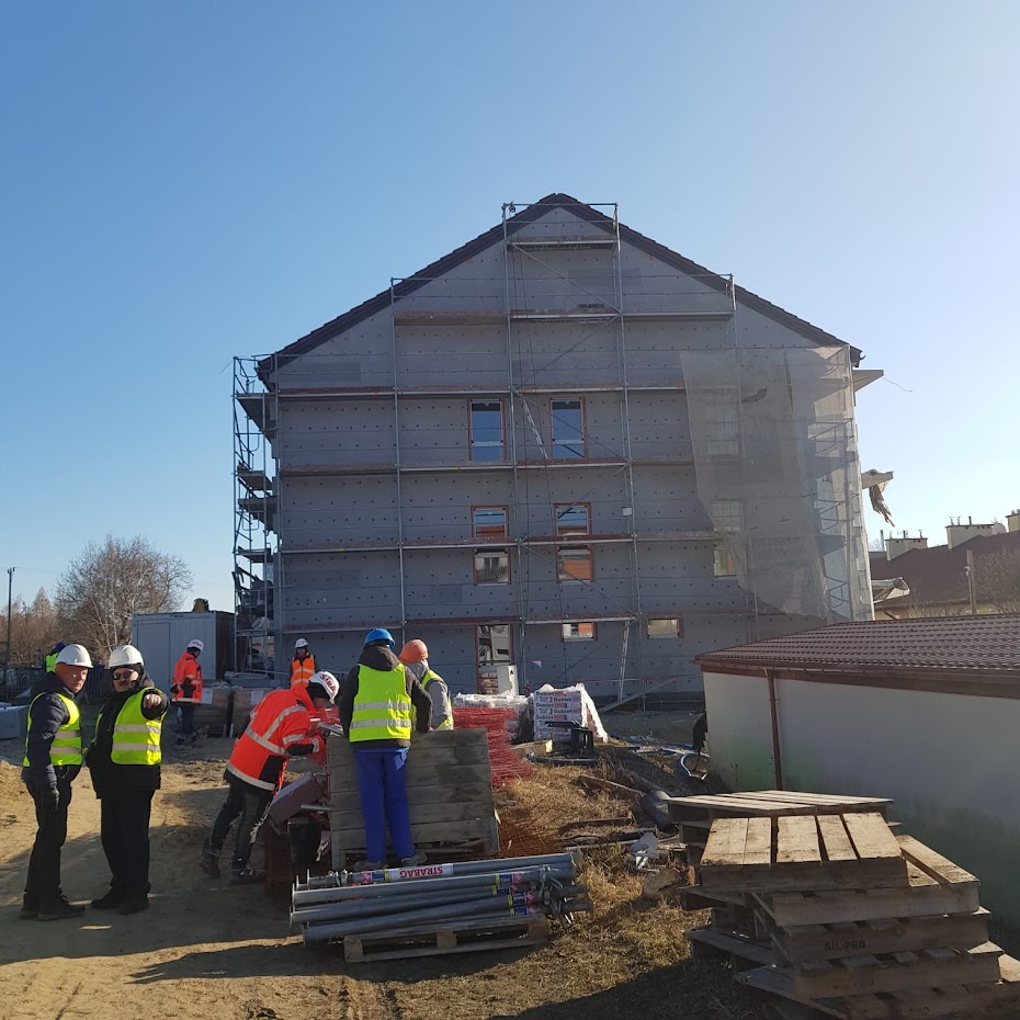 Prace budowlane, których całkowita wartość wynosi 8 744 475 zł brutto, są obecnie bardzo zaawansowane. Całkowity stopień zaangażowania robót ocenia się na około 60%. Na placu budowy widać wyraźne postępy. Zakończono już kluczowe etapy konstrukcyjne: robotny murarskie i wykonano więźbę dachową. Wstawiona została także stolarka okienna. Obecnie trwają intensywne prace zarówno na zewnątrz, jak i wewnątrz obiektu. Na elewacjach prowadzone są roboty dociepleniowe, na dachu układane jest poszycie z dachówki. Wewnątrz budynku monterzy układają instalacje elektryczne i sanitarne, a jednocześnie trwa tynkowanie pomieszczeń.